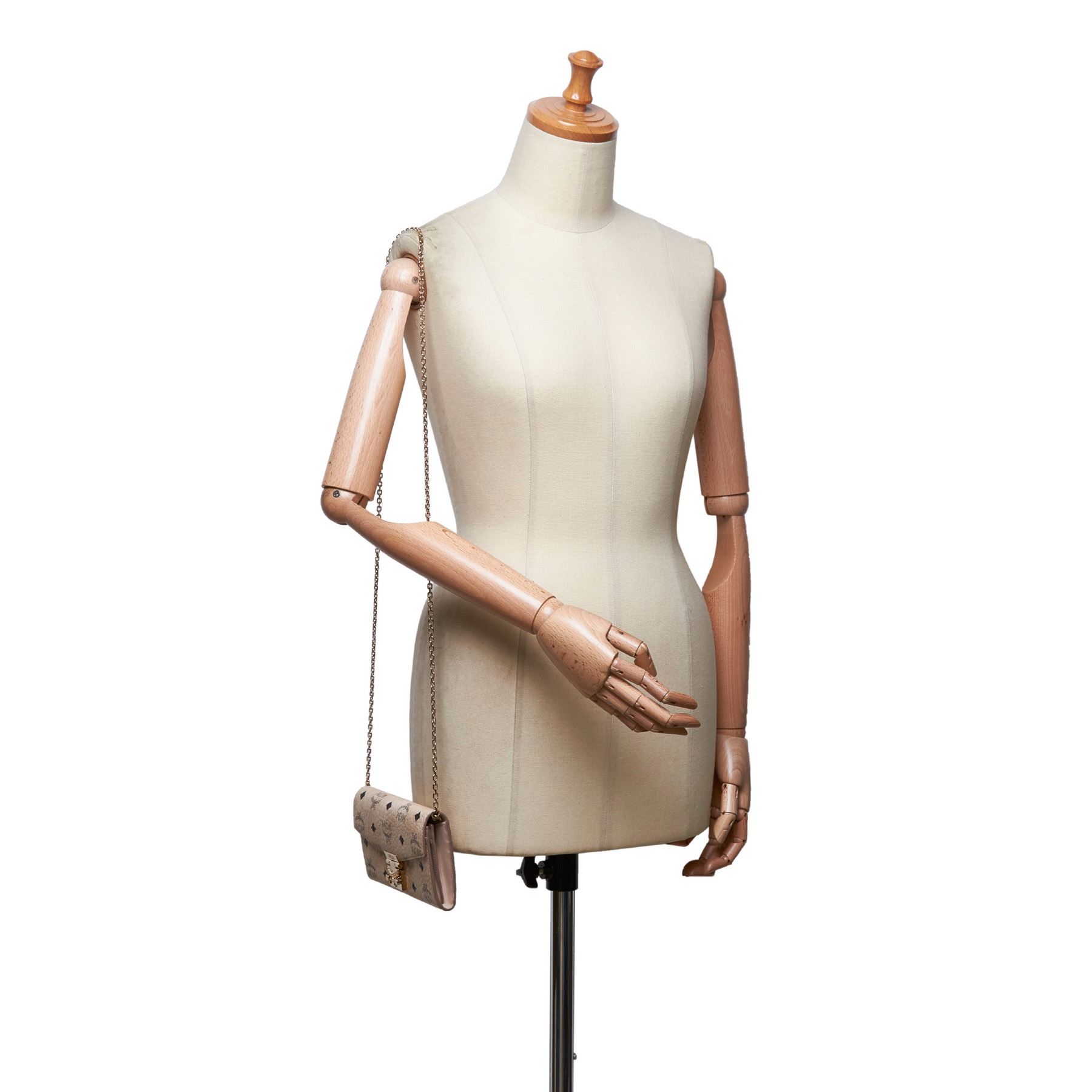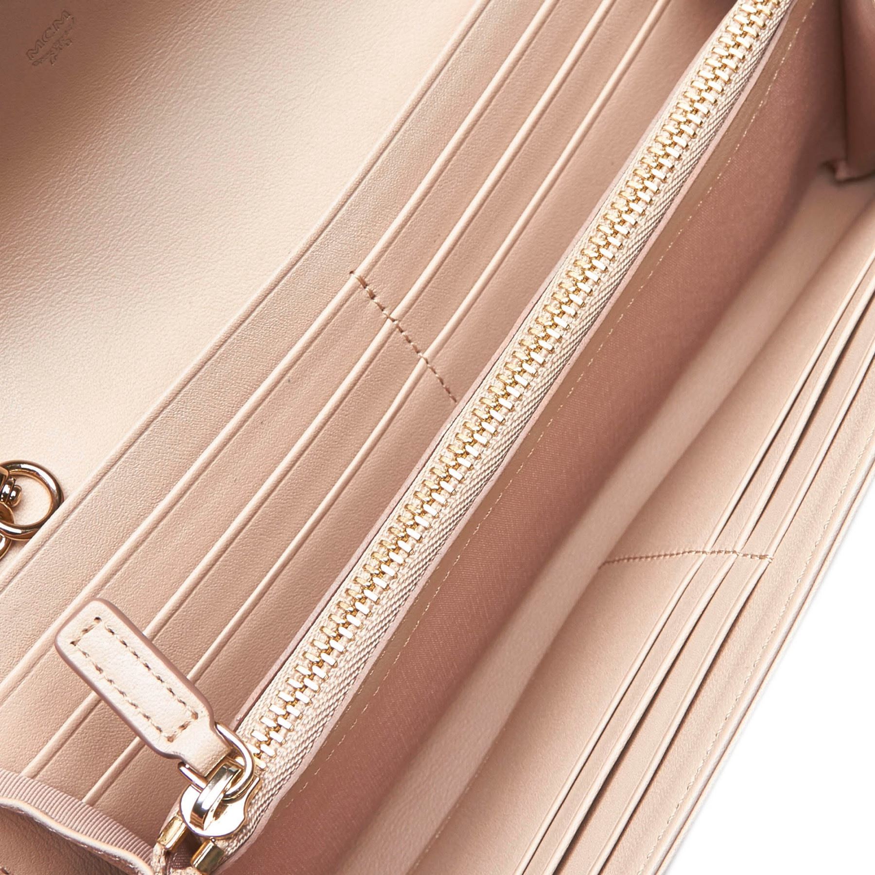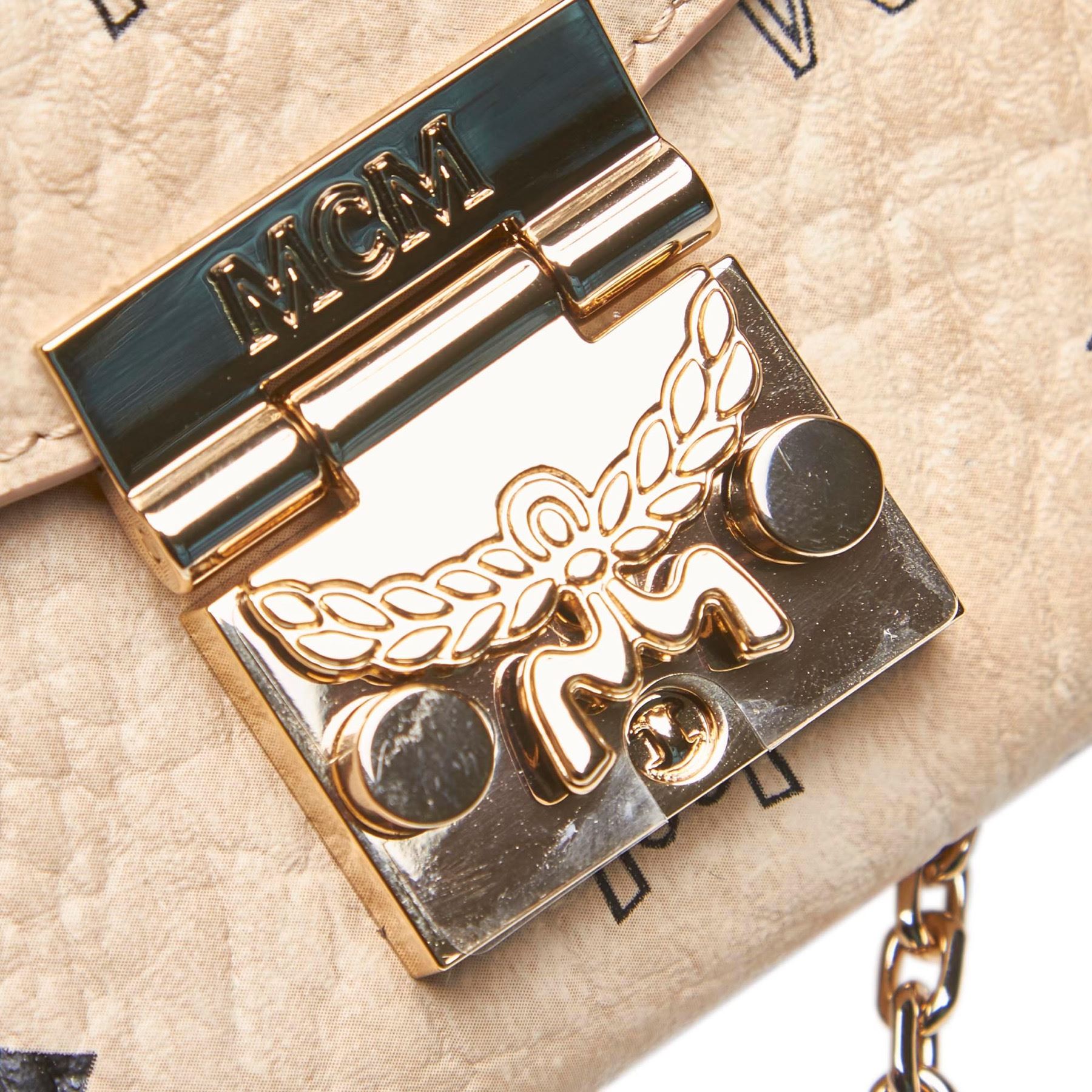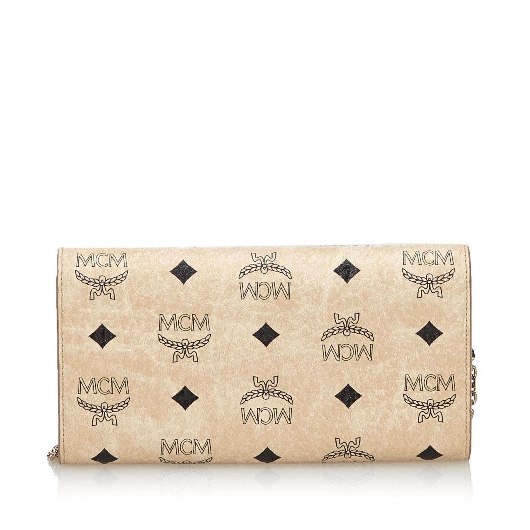 The Patricia wallet on chain features a coated canvas body, a silver tone chain strap, a front flap with a metal lock closure, and interior zip and slip compartments. Fabric x Coated Canvas x Metal x Others White x Black Buckle is scratched. Size: 10 x 19 x 0 Card: NO Made in: Germany