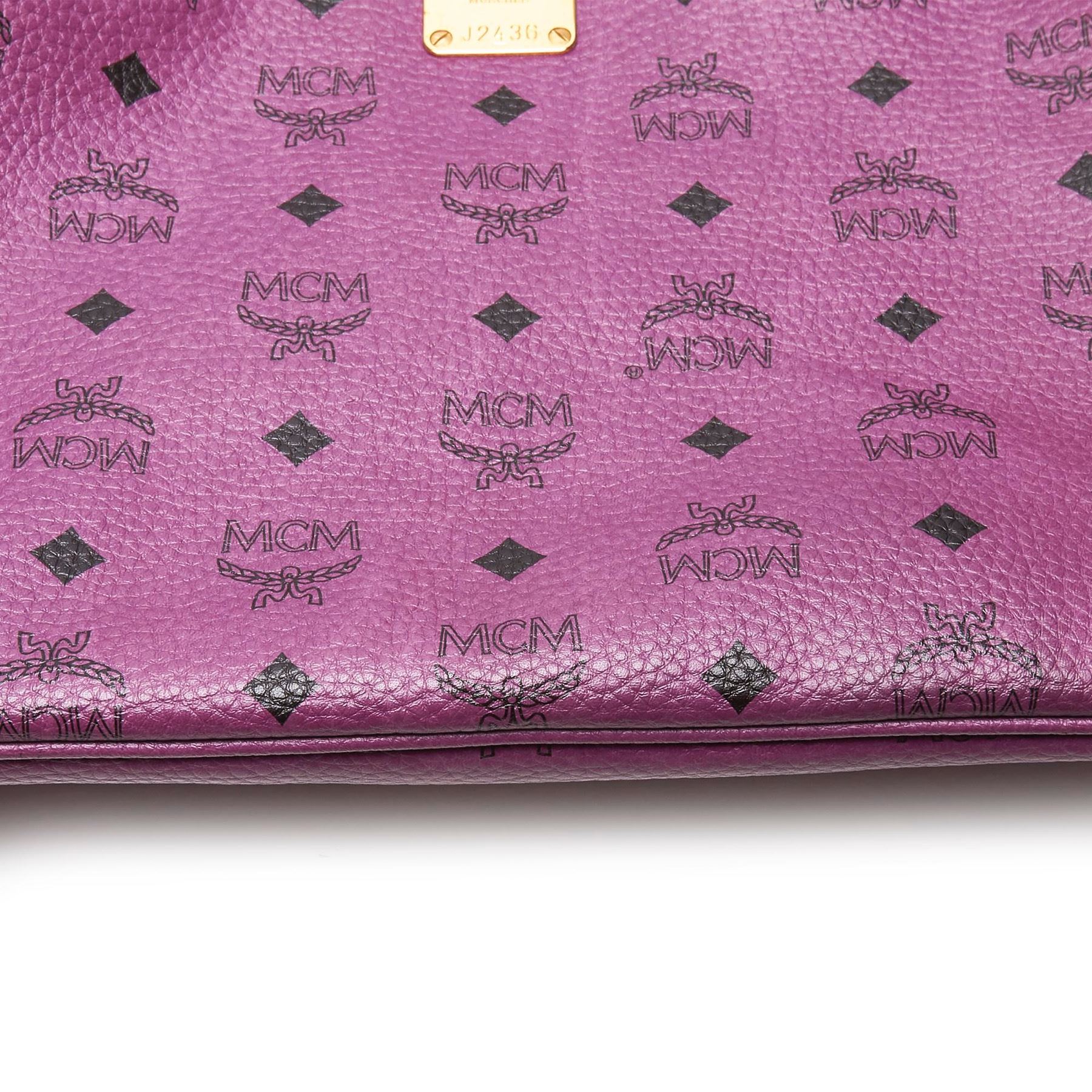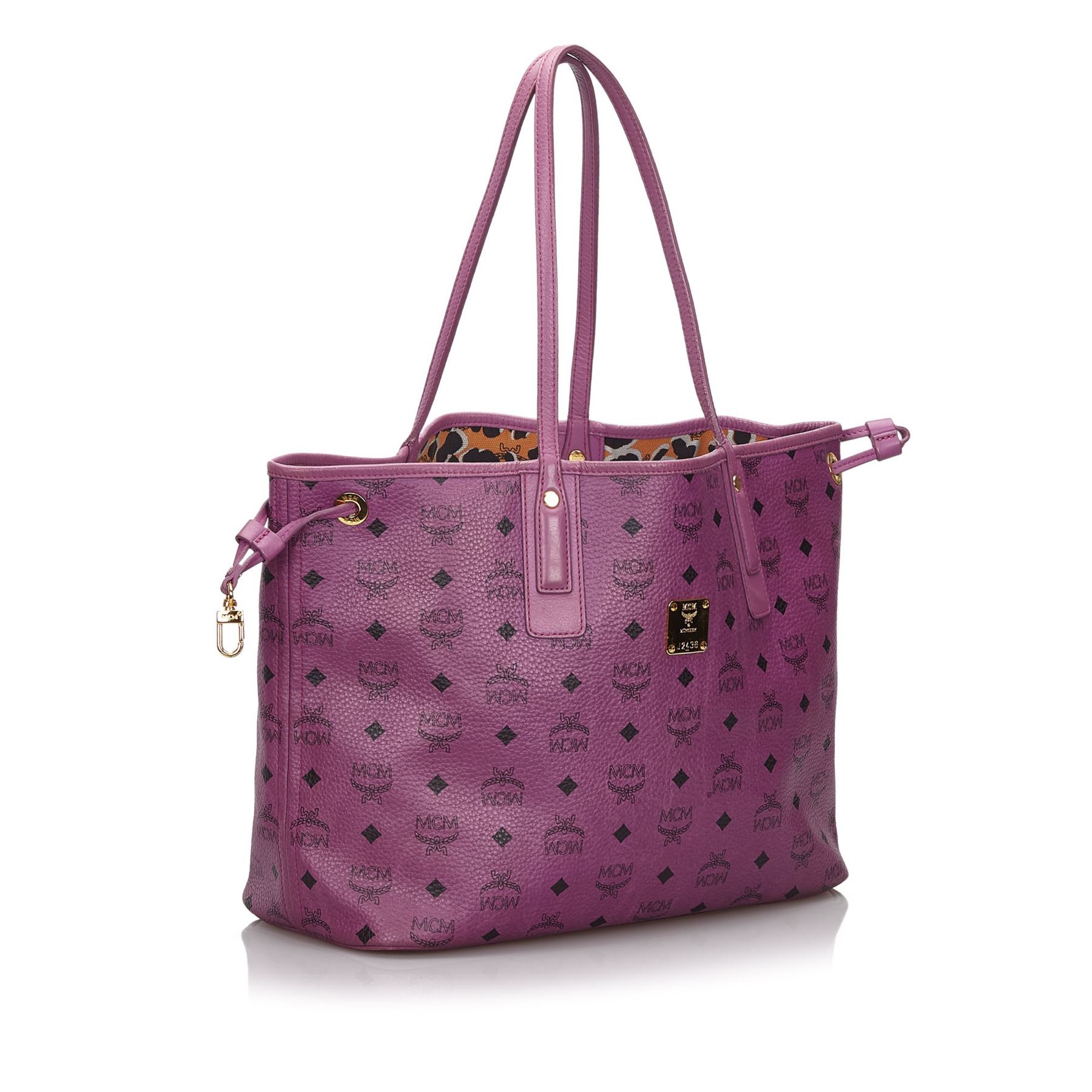 This tote bag features a leather body, flat shoulder straps, an open top with side drawstring, and a leopard print canvas lining. Leather x Others x Fabric x Canvas Purple x Multi Exterior front is stained. Exterior back is scratched. Exterior bottom is stained and discolored. Exterior handle is loose stitching. Exterior corners is discolored and loose stitching. Size: 28 x 35 x 16 Card: NO Made in: GERMANY