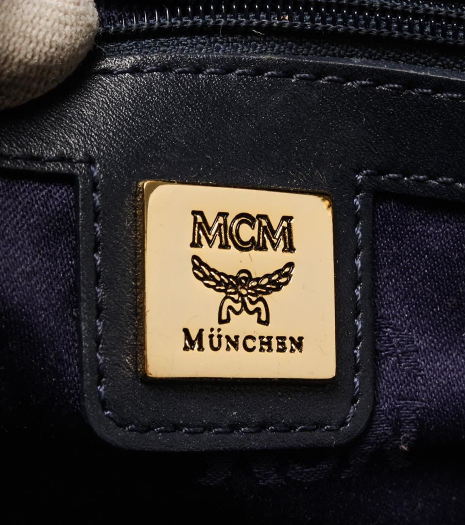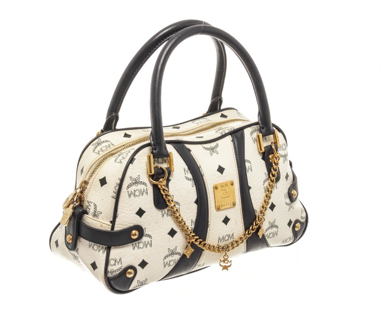 One MCM White Coated Canvas Tote Bag. Item is sold AS-IS. All available information is listed in the description and shown in the photo. MCM White Coated Canvas Tote Bag with top handle, gold hardware, gold chain, blue fabric lining, zipper closure.