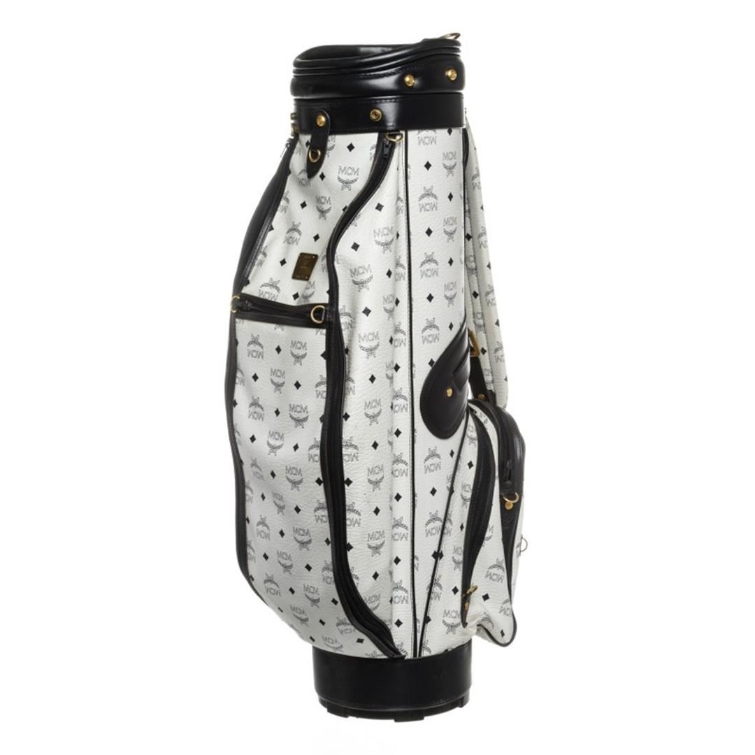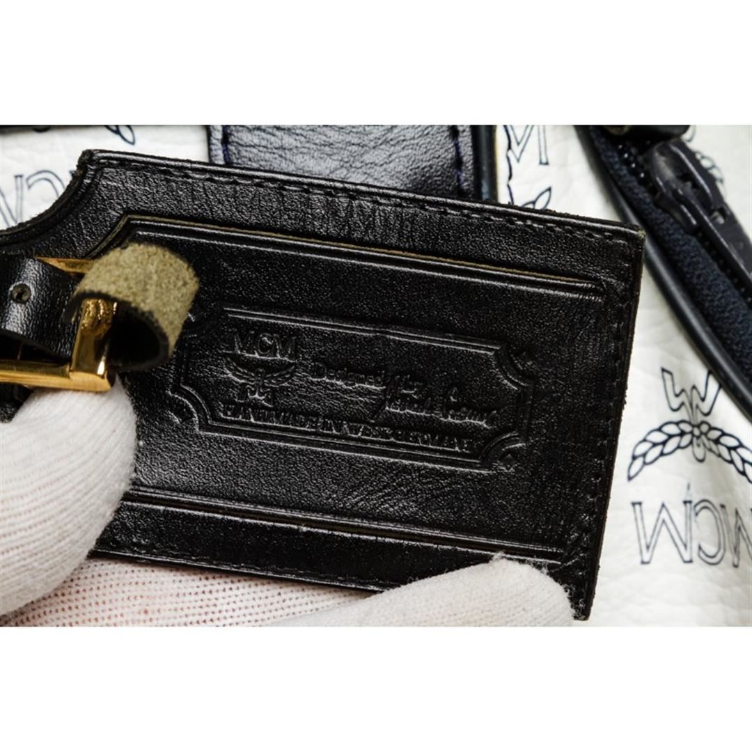 White leather with MCM monogram print, navy blue leather trim, brass hardware throughout. Single flat shoulder strap. Zip pockets and a divided compartment rest a top. Item is pre-owned.