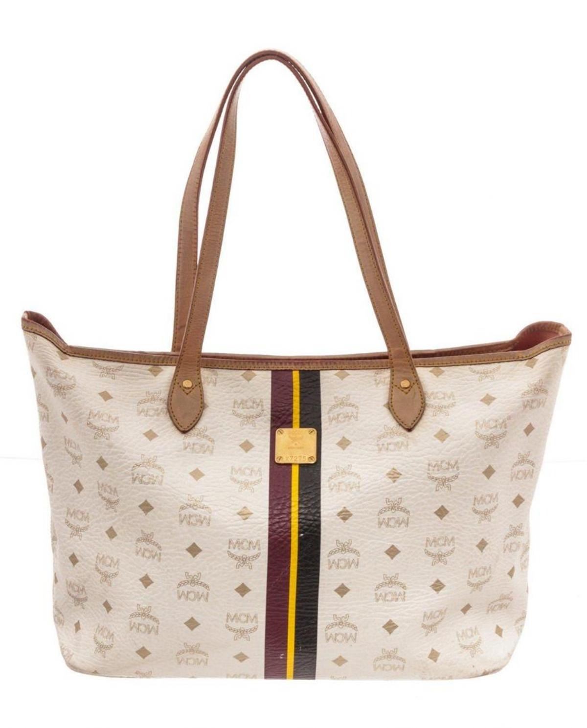 MCM white Visetos coated canvas shopper tote bag with beige leather trim, gold-tone hardware, single interior slip pockets and leather handles. CONDITION: Pre-Owned Good overall, please see photographs for detail.