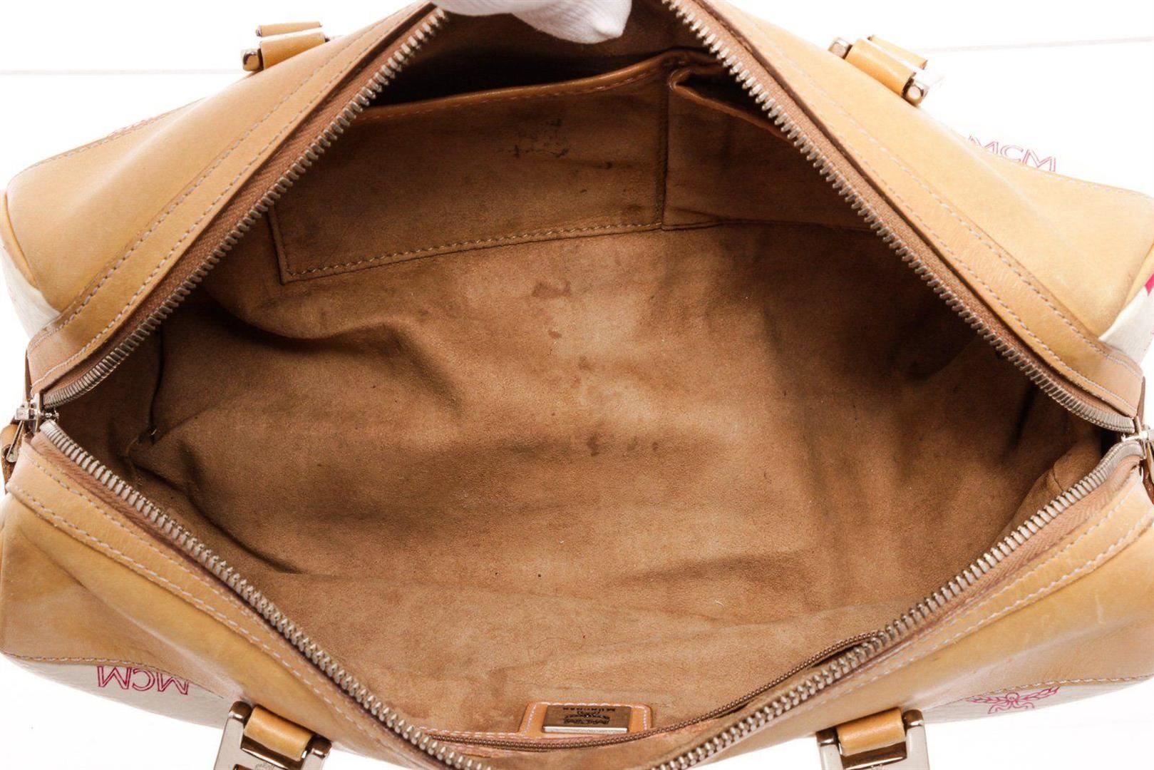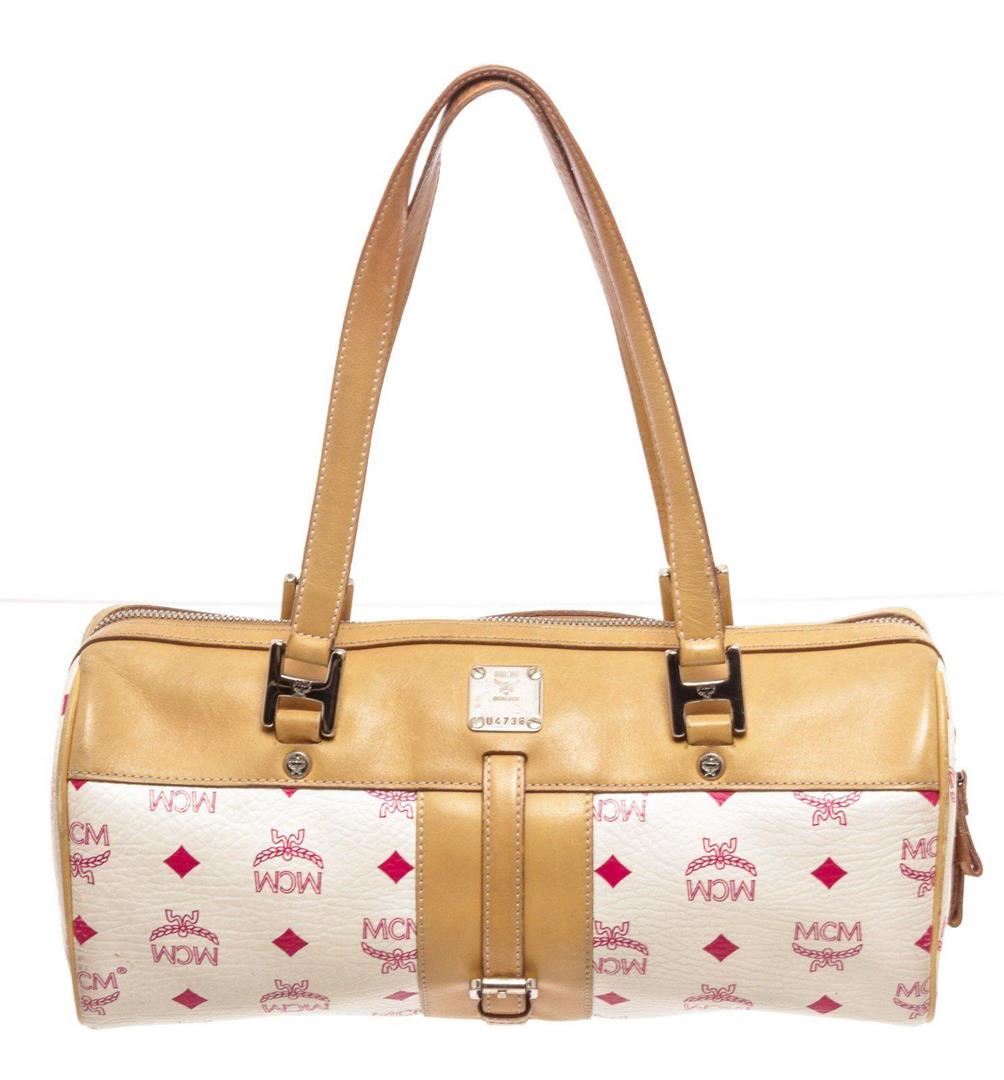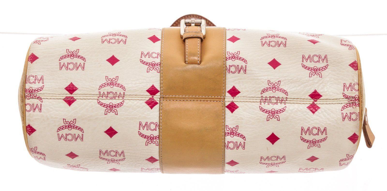 MCM white Vesitos coated canvas tote bag with beige leather trim and handles, gold-tone hardware, three interior pockets; one with zip closure, dual top handles, and overall zip closure at top. Condition: Pre-Owned Good overall, please see photographs for detail.
