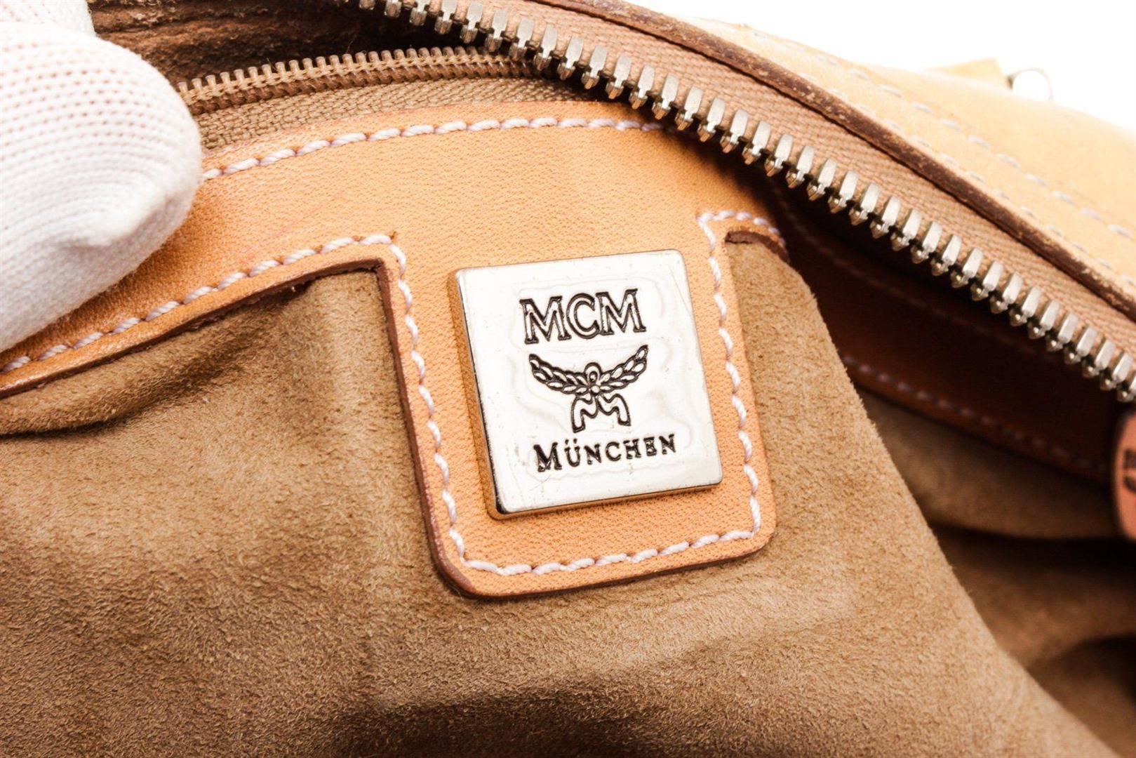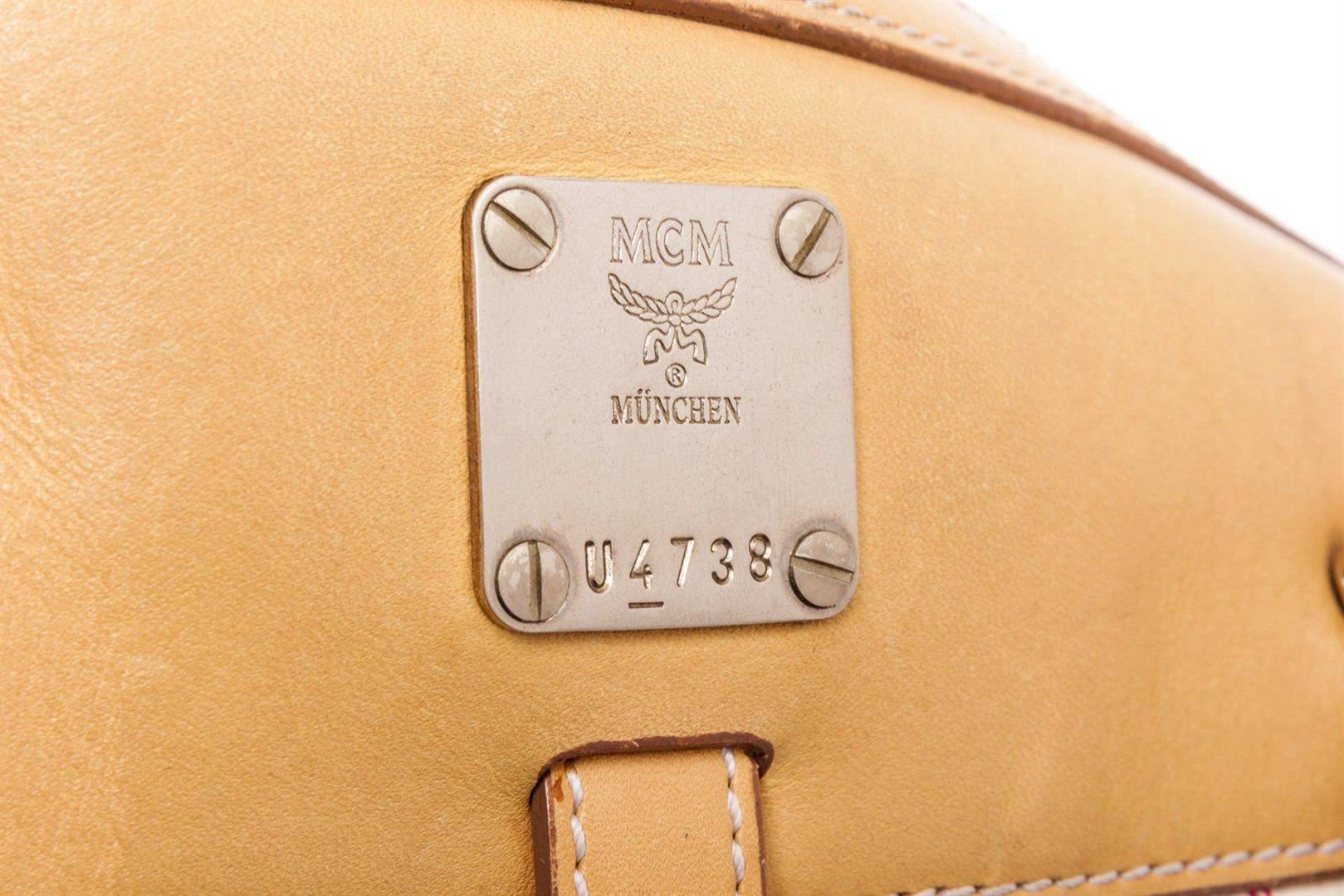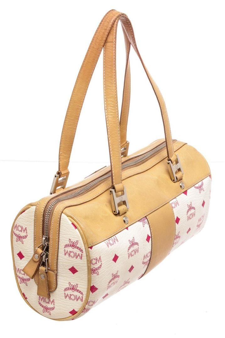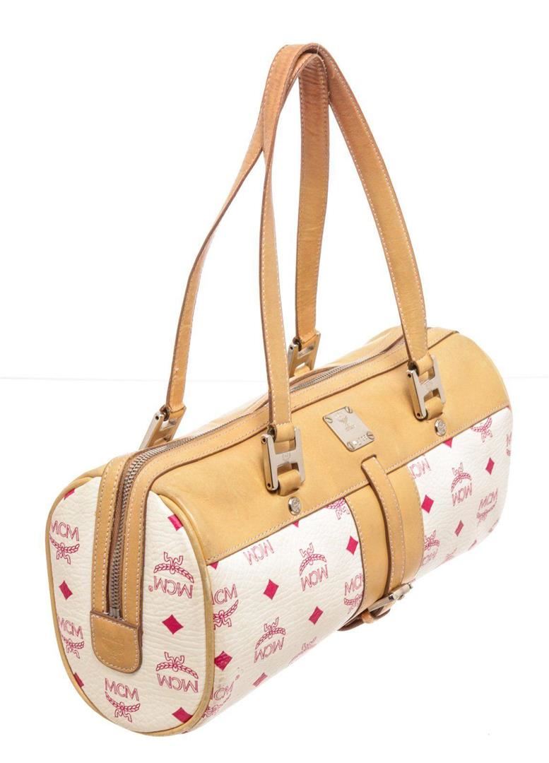 MCM white Vesitos coated canvas tote bag with beige leather trim and handles, gold-tone hardware, three interior pockets; one with zip closure, dual top handles, and overall zip closure at top. Condition: Pre-Owned Good overall, please see photographs for detail.