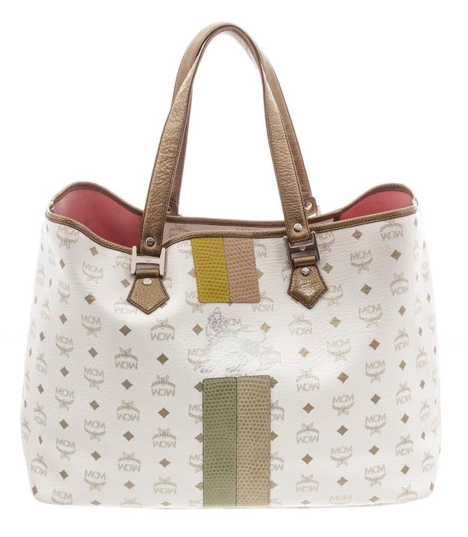 MCM White Visetos Coated Canvas Lion Shopper Tote with silver-tone hardware, dual flat shoulder straps, gold leather trim, snakeskin embossed leather multicolor stripes and lion design at front, Pink canvas interior lining, one interior pocket and overall clasp closure. Measurements: Length: 18 in / 46 cm Width: 7.5 in / 19 cm 13 in / 33 cmCONDITION: Pre-Owned Good overall, please see photographs for detail.