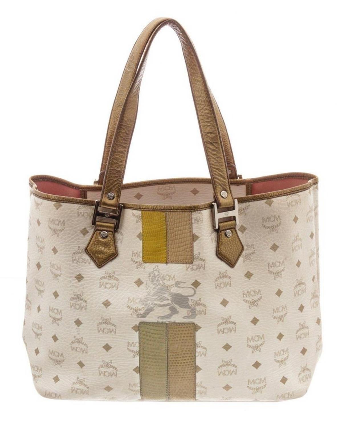 MCM White Visetos Coated Canvas Lion Shopper Tote with silver-tone hardware, dual flat shoulder straps, gold leather trim, snakeskin embossed leather multicolor stripes and lion design at front, Pink canvas interior lining, one interior pocket and overall clasp closure. Measurements: Length: 18 in / 46 cm Width: 7.5 in / 19 cm 13 in / 33 cmCONDITION: Pre-Owned Good overall, please see photographs for detail.