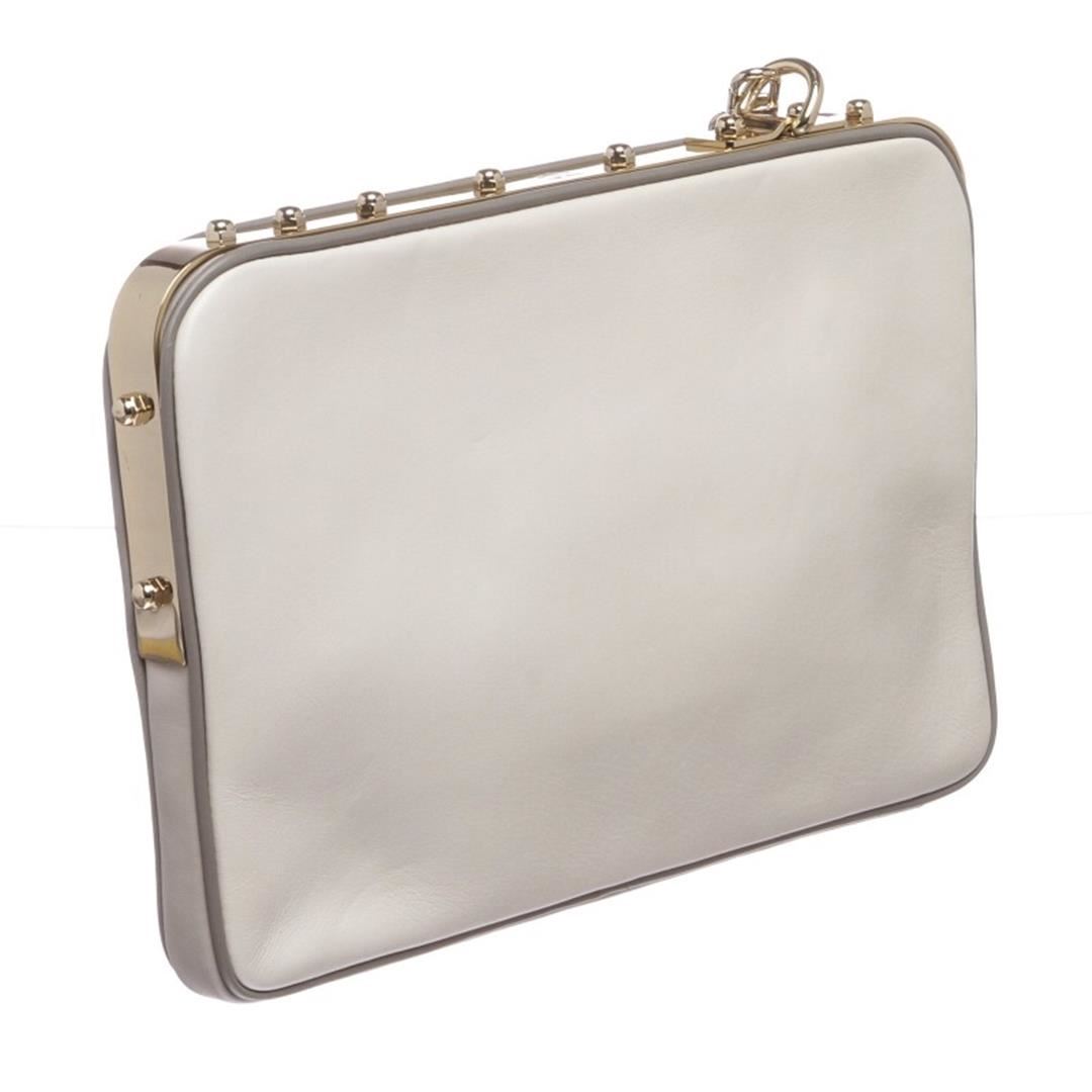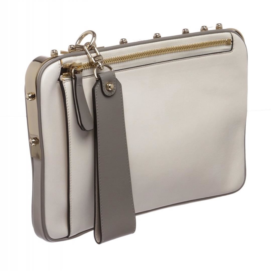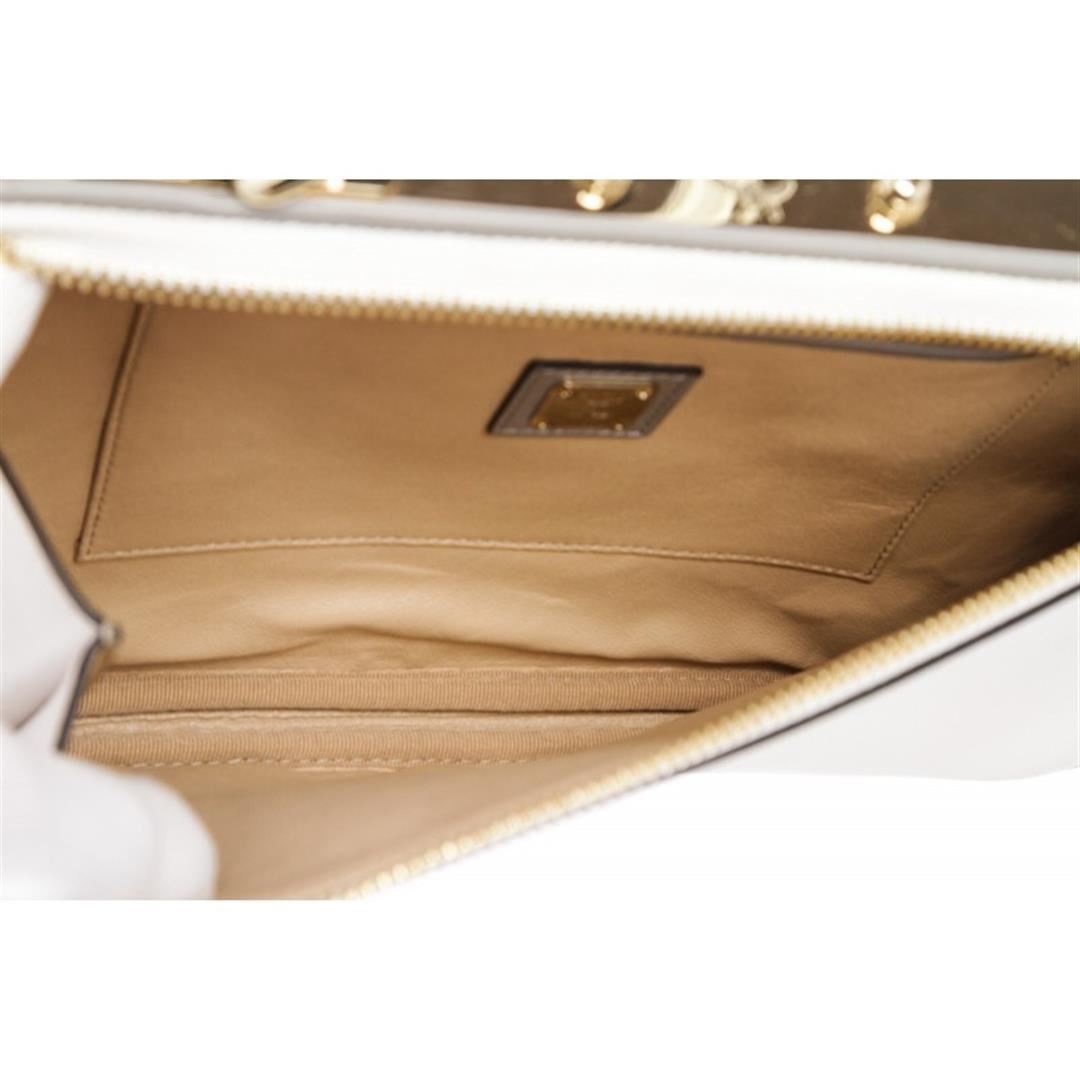 Crafted out of white and gray leather with gold tone hardware. Wristlet handle sits a top gold tone hardware, side zip closure. Inner beige leather lining one side slip pocket. Item is Pre-Owned.