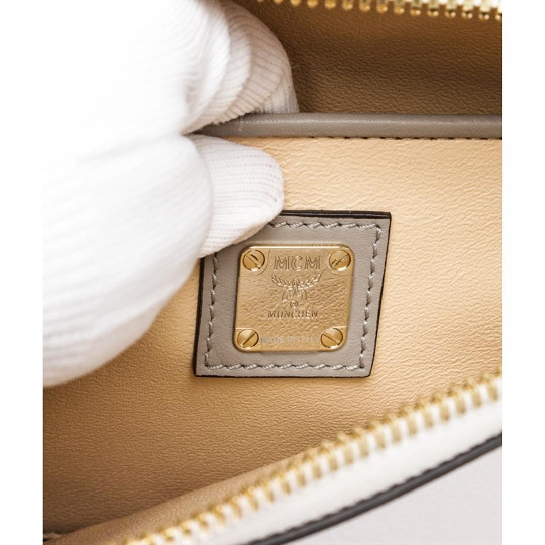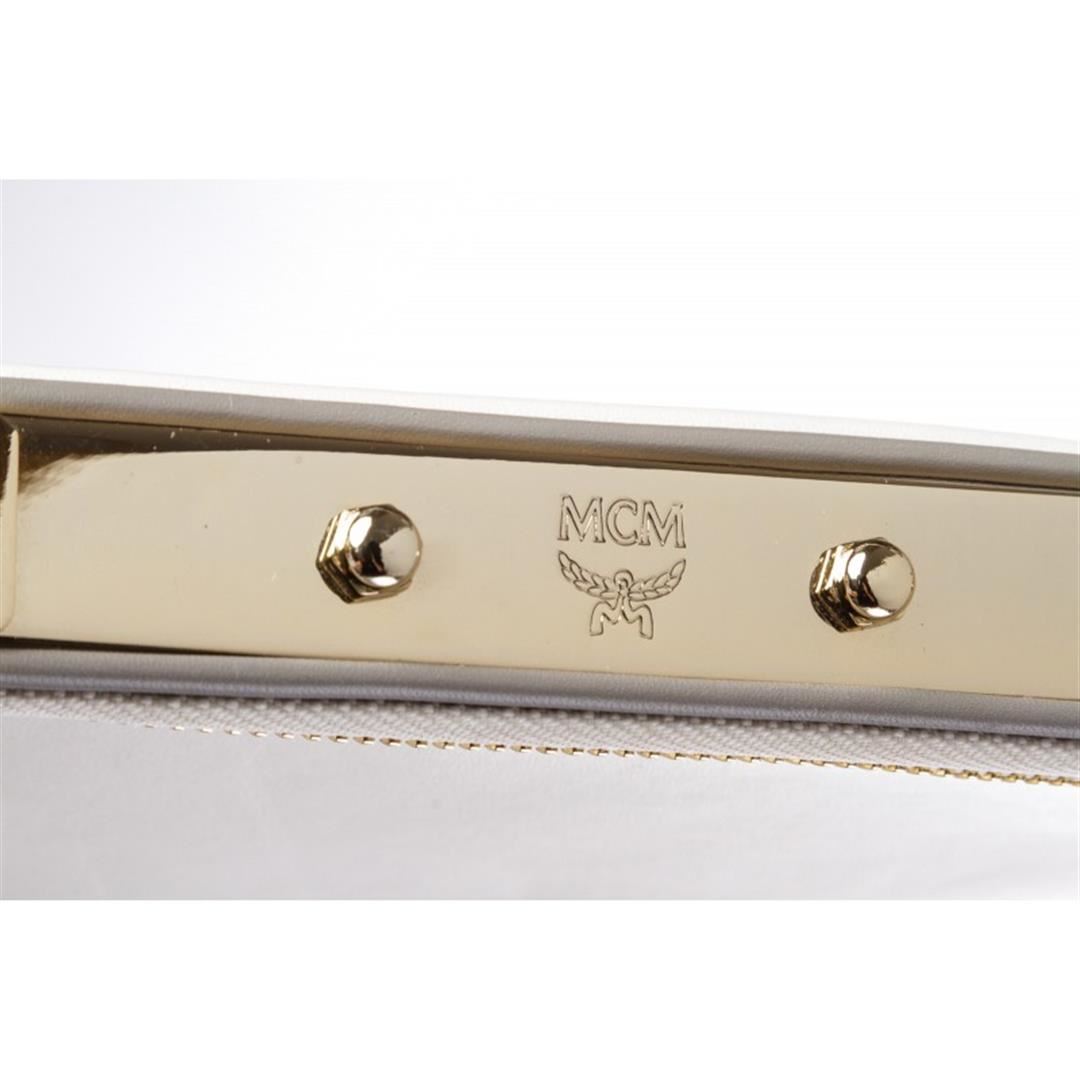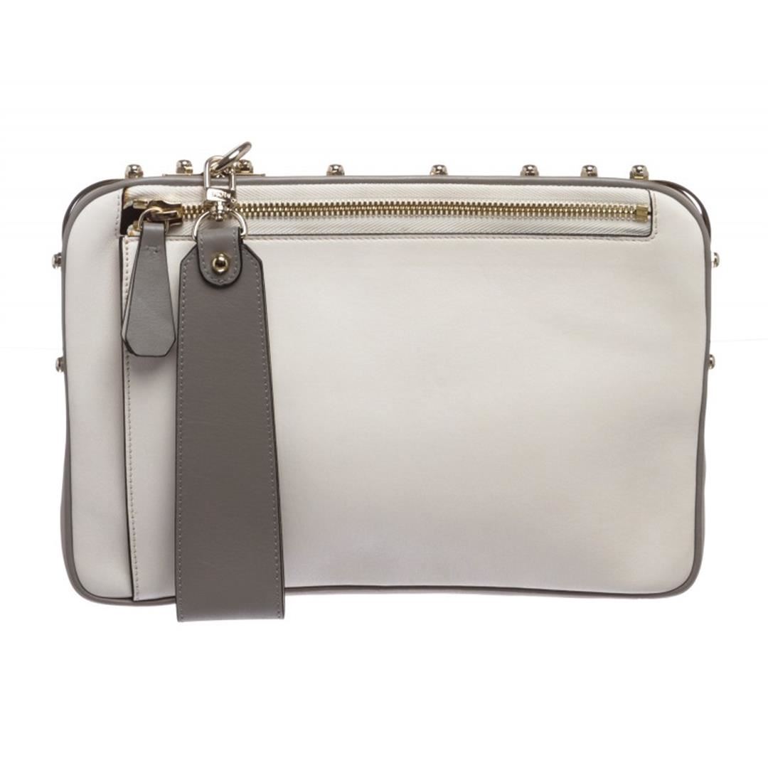 Crafted out of white and gray leather with gold tone hardware. Wristlet handle sits a top gold tone hardware, side zip closure. Inner beige leather lining one side slip pocket. Item is Pre-Owned.