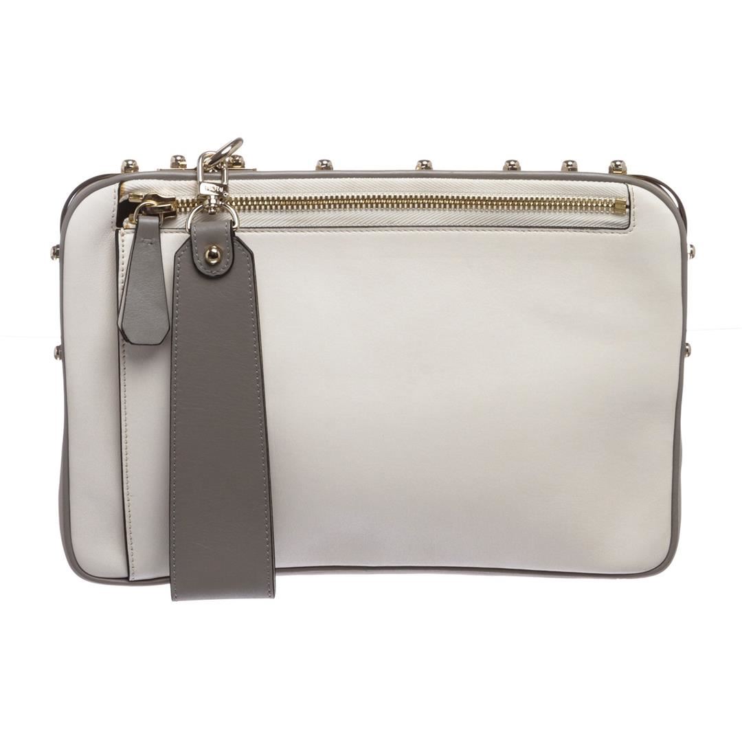Crafted out of white and gray leather with gold tone hardware. Wristlet handle sits a top gold tone hardware, side zip closure. Inner beige leather lining one side slip pocket.
