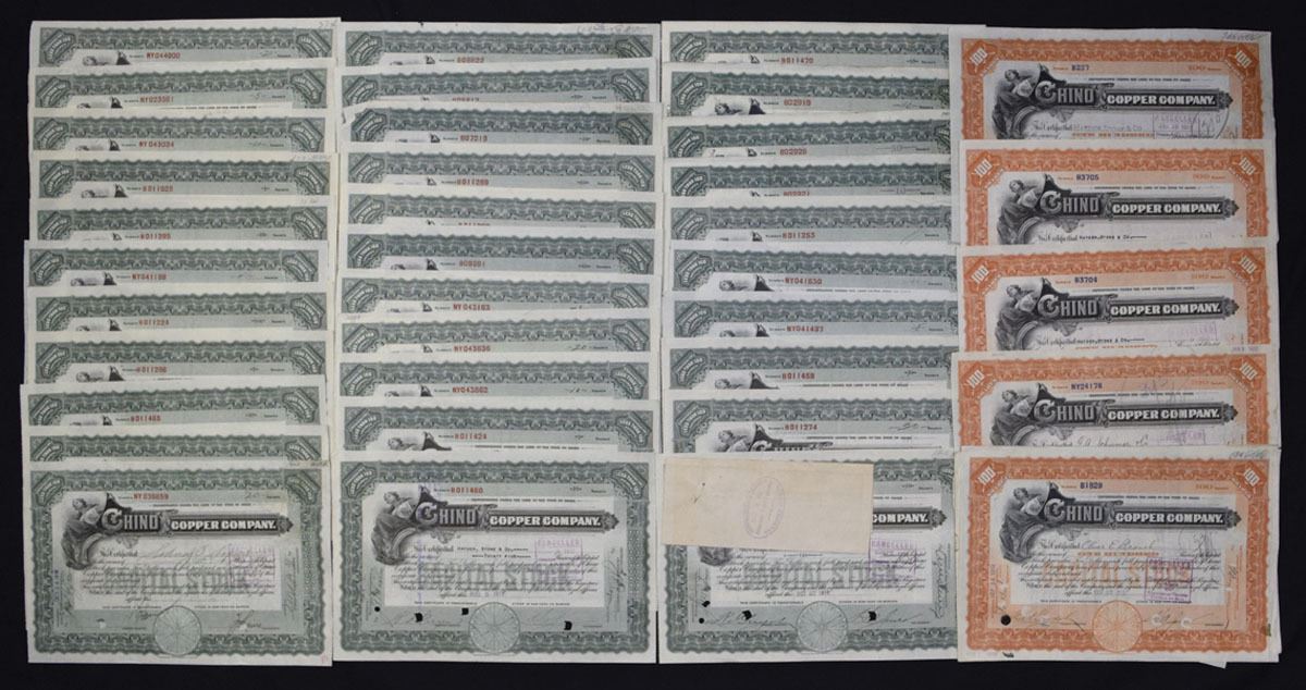 Maine, 1911-17. Lot of 37 I/C Stock Certificates for <100 Shares Capital Stock (32) with green border and 100 Shares Capital Stock (5) with orange border. All have title at top center with allegorical woman sitting over at left, POCS, and range from VF to XF condition. IBNC. (37). Sold "AS IS" no returns accepted.
