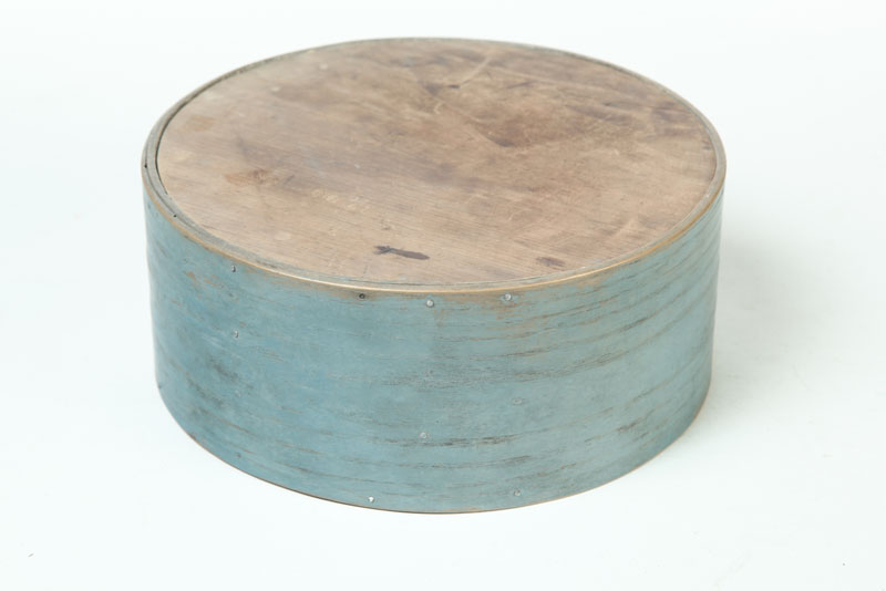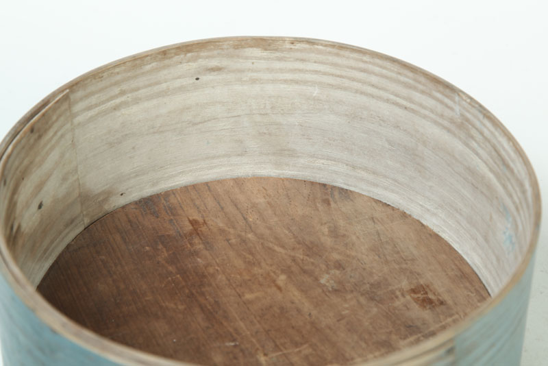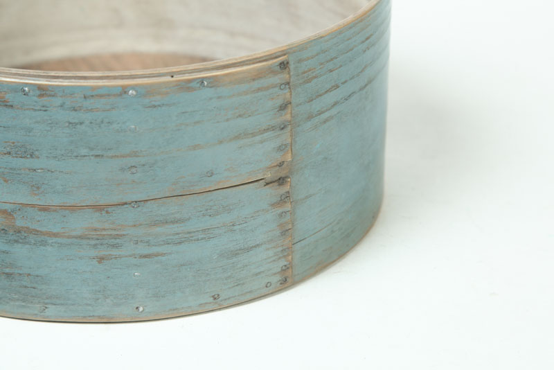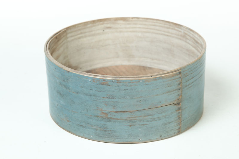 Found in New Hampshire, late 19th century. Bentwood with steel tacks and old robin's egg blue paint. Some edge loss. 4 1/2"h. 10 1/2"d.