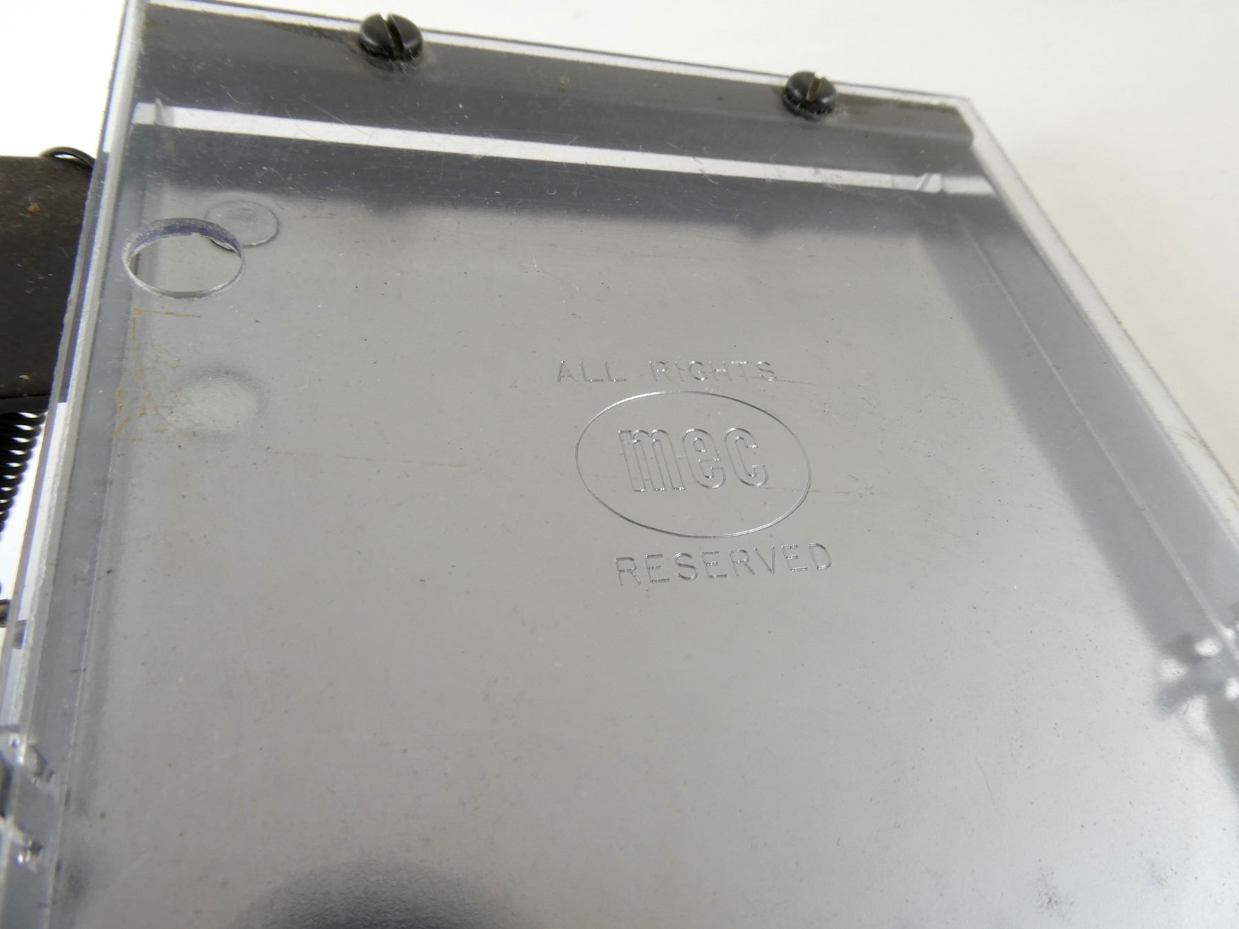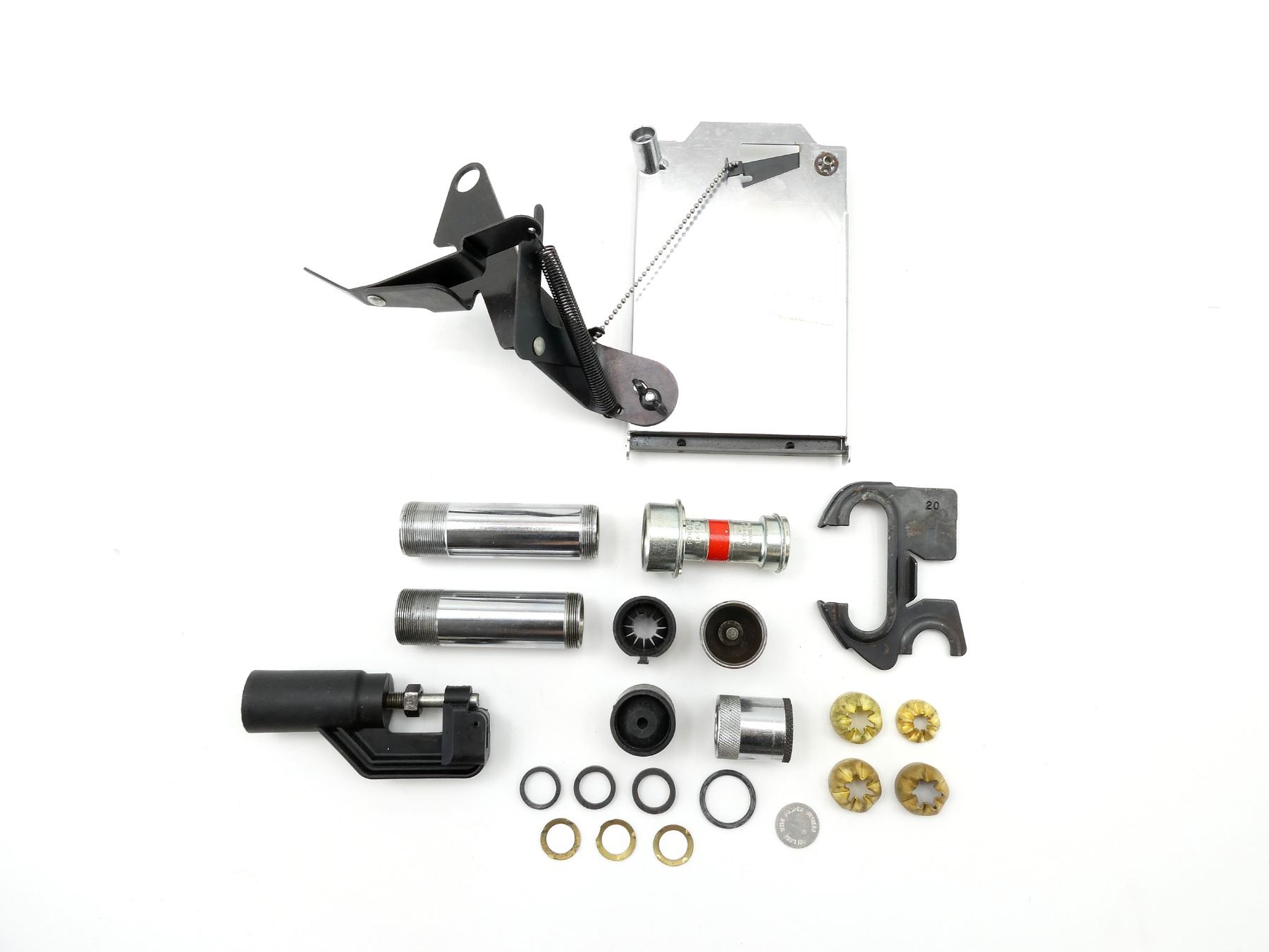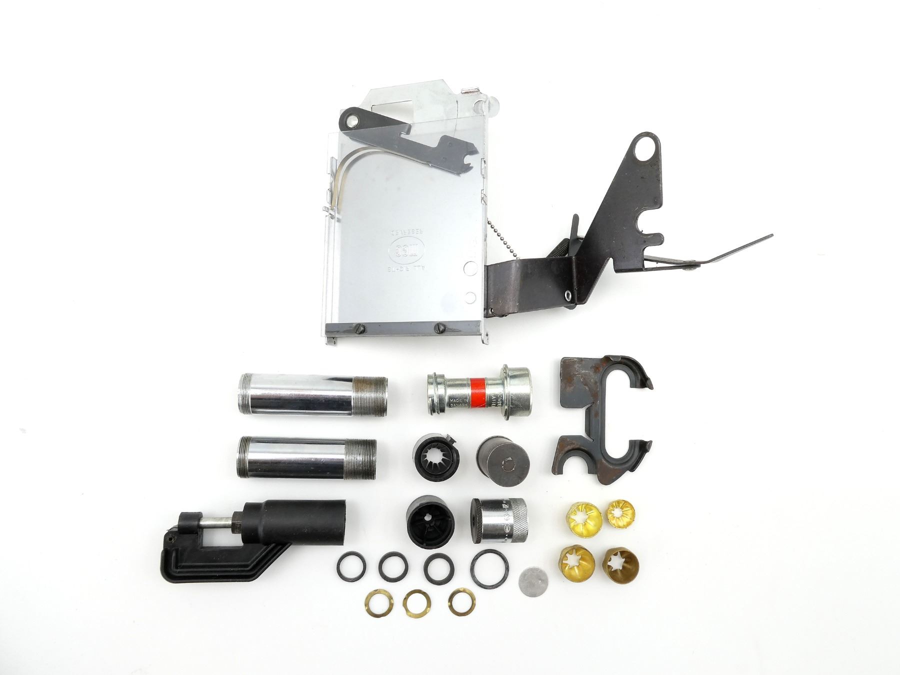 FITS VARIOUS MEC SHOT SHELL PRESS MODELS, LOT INCLUDES; (1) MEC PRIMER TRAY, MAY REQUIRE ADJUSTMENTS AND/OR MAY NOT BE COMPLETE, (1) MEC POWDER BAFFLE, (7) ASSORTED SIZED CRIMPERS, VARIOUS MATERIALS, (1) BLUED STEEL PLATE MARKED: "20" (20 GA.), ETC. SEE PHOTOS.