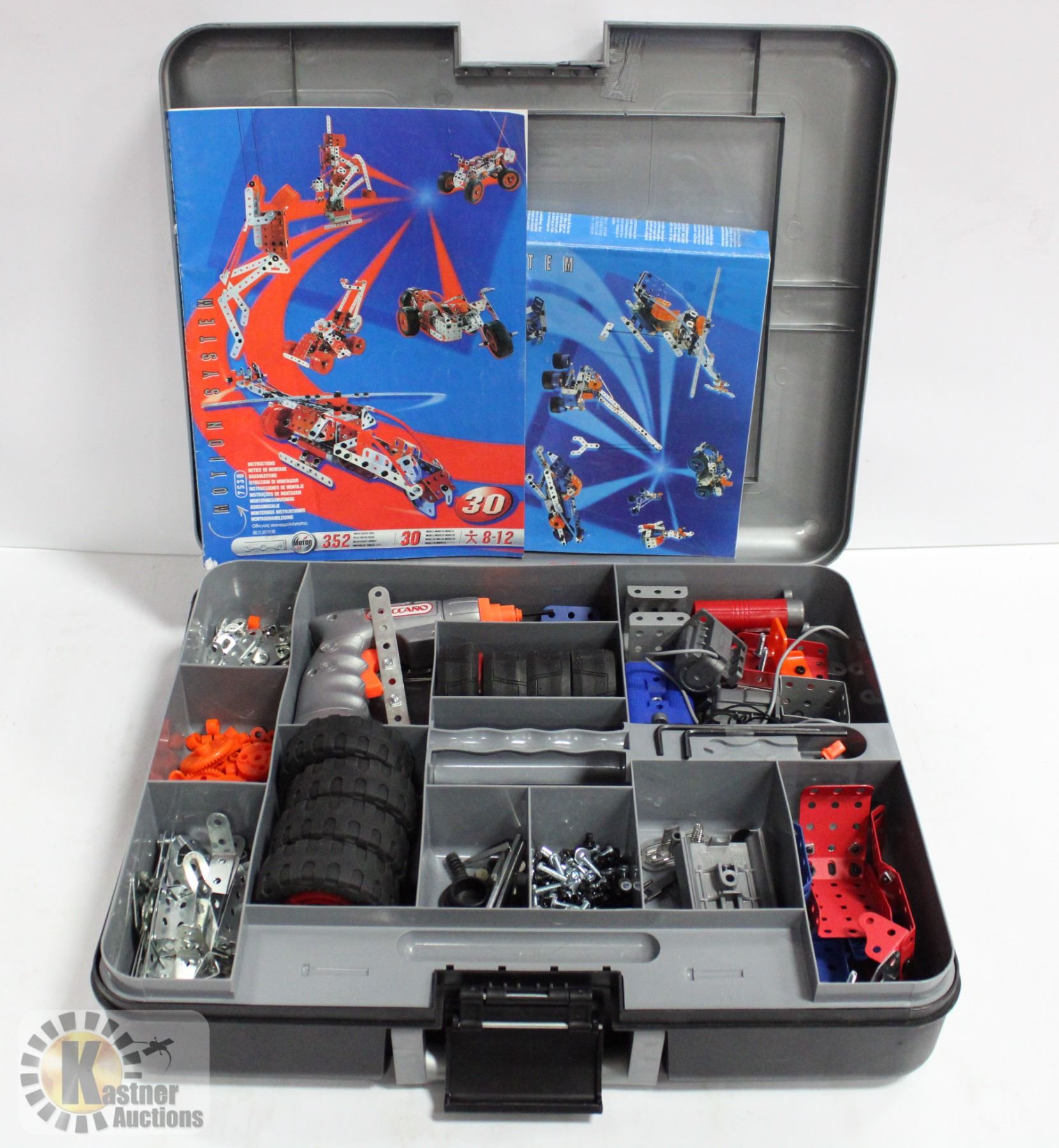 MECCANO MOTION SET, AT LEAST 400+ PIECES, WITH 2 INSTRUCTION MANUALS AND HARD PLASTIC CASE. 2 MOTION SYSTEMS AND WORKING ASSEMBLY TOOL. USES AA AND 3V BATTERIES . PLEASE NOTE - THE CASE HAS A CRACK AT THE HANDLE