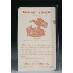 MECHANICAL BANK TRADE CARD. This trade card for American Eagle mechanical bank has an image of the bank and text on one side. SIZE: 5 1/2” w. x 3 1/4” h. CONDITION: Small stain on the edge, otherwise, generally good. 1-4676 (100-300)