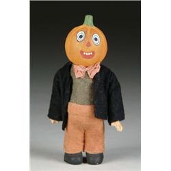 MECHANICAL HALLOWEEN FIGURE. Composition pumpkin-head on cardboard body with wind-up vibrating mechanism. Felt clothing. SIZE: 6” t. CONDITION: Replaced or repainted head not original to toy; working condition. WP 1-3762 (600-800)