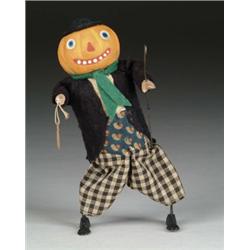 MECHANICAL PUMPKIN FIGURE. Cloth dressed tin body with wind-up movement. Composition pumpkin-head figure sways side to side. SIZE: 7” t. CONDITION: Replaced or repainted head not original to toy; clothes are good and toy is working. WP 1-3717 (1,200-1,500)
