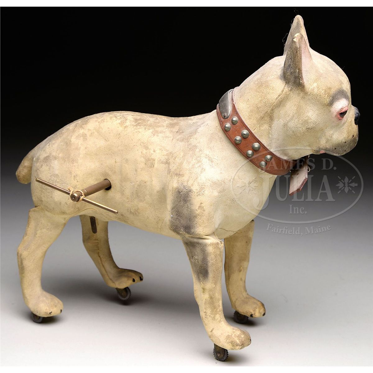 Beautifully made toy is actually completely covered in kid soft leather. Boxer-like facial features with glass eyes and hand painted details. Leather studded collar. When wound Boxer walks forward with moving head and squeak box emitting a "bark". Quality toy with lots of crossover interests. SIZE: 11-1/2" l. 10" h. CONDITION: Complete, very good plus and working. 1-13484