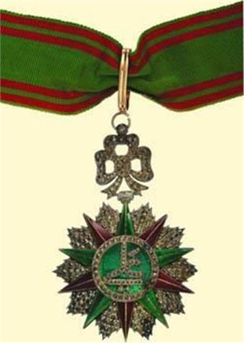 Commander's Decoration - Type Ali Bey; neck badge, silver brilliant cut, with red and green enamelled gold onlays, green enamelled centre, with ornamental bow above and gold suspension loop and original ribbon; French hallmarks, maker's mark "...KRETLY, PARIS...". Extremely fine quality with stylized cypher of Ali Bey, near best condition with fine patina!