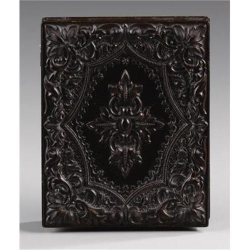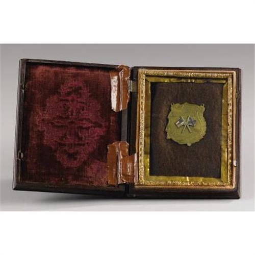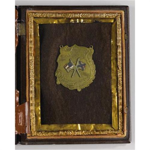 <B>MEDAL “REUNION CONFEDERATE VETERANS” NASHVILLE, TENN. 1897</B></I> -UCV brass medal missing it’s ribbon, has a painted Confederate and U. S. Flag, commemorating the Confederates Reunion, being held at Nashville, Tennessee, June 22-28. This medal is housed in a, one quarter plate gutta-percha case, with floral design, case is in great condition the hinges on inside have been taped as they are loose. Also this lot has a Nashville re-union programme from 1904. <BR><BR><B>Provenance:</B></I> CSA Surgeon Samuel Caldwell, Forrest's Cavalry<BR><BR><B>Condition: </B></I> Medal is very fine, gutta-percha case very fine except hinges being loose and a couple of minute chips. Program has cover separation.<BR><BR><b>Shipping:</b> Miscellaneous Collectibles, Smal (<a target="_blank" href="http://www.heritageauctions.com/common/shipping.php">view shipping information</a>)