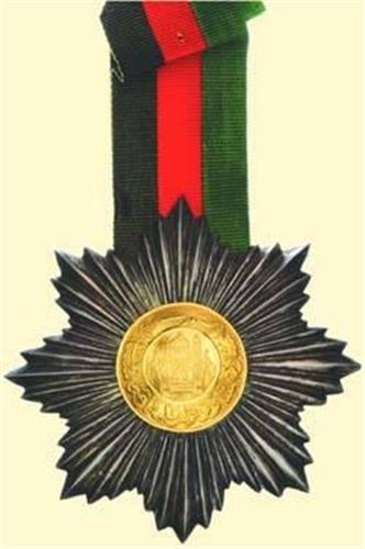 Breast Badge (4th Class); breast badge, eight pointed silver corpus (diam.: 79 mm), circular gold medallion with coat of arms, name of the order and sign of grade (Arabic "4", diam.: 28,5 mm); flat loop on reverse, with Arabic inscription; with short ribbon (green/red/black).