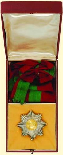 Breast Star (2nd Class); breast star, eight pointed silver corpus (diam.: 84 mm), circular gold medallion with coat of arms, name of the order and sign of grade (Arabic "2", diam.: 28,5 mm); reverse with vertical wide tapered pin, two side hooks and scratched Arabic inscription; with original sash (dark red / green / dark red) in original box of issue. With enclosed handwritten wearing instructions. Very fine quality!