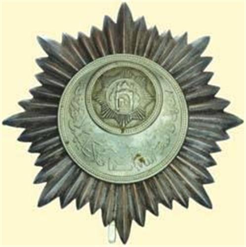 Breast Star 2nd Class (1st Type); breast star, eight pointed metal corpus (diam.: 75,5 mm) with white metal medallion (diam.: 41 mm) with excentric coat of arms (old type), name of the order and sign of grade (Arabic "2"); wide tapered vertical pin on reverse; signs of gold-bronzing. Probably European production! Signs of wearing!