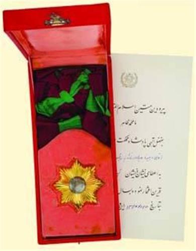 Grand Cross Breast Star (1st Class); breast star, eight pointed gold corpus (diam.: 87 mm, weight: 72 gramme), circular silver medallion with coat of arms, name of the order and sign of grade ("|", diam.: 29 mm); horizontal wide tapered pin; with scratched Arabic inscription; with original sash (wine red / green / wine red) in original box of issue. With connecting documents (Arabic document and three French letters / blue prints in large envelope) for a French diplomate, 1930. Very fine quality!