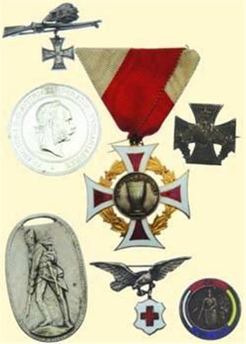 Large Silver Price Medal for Horse Breeding / Franz Joseph I., Cross of Merit (private club; bronze, obverse partially enamelled), Large Silver Medal (30th Honved Infantry Regiment) and four Patriotic Badges - Austria/Germany (WW I, metal partially enamelled).