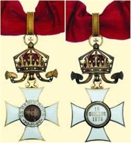 Commander's Cross (3rd Class); neck badge - 2nd type, silver gilt, white enamelled, hallmarked (head/Russia?), maker's mark not legible; with crown 2nd type with red enamel case, ring and suspension loop probably added later, with new ribbon. Very fine old quality before WW I, small signs of wearing!