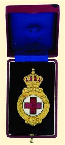 Red cross badge of honour with pin back, bronze gilt, partially enamelled, in original box of issue.