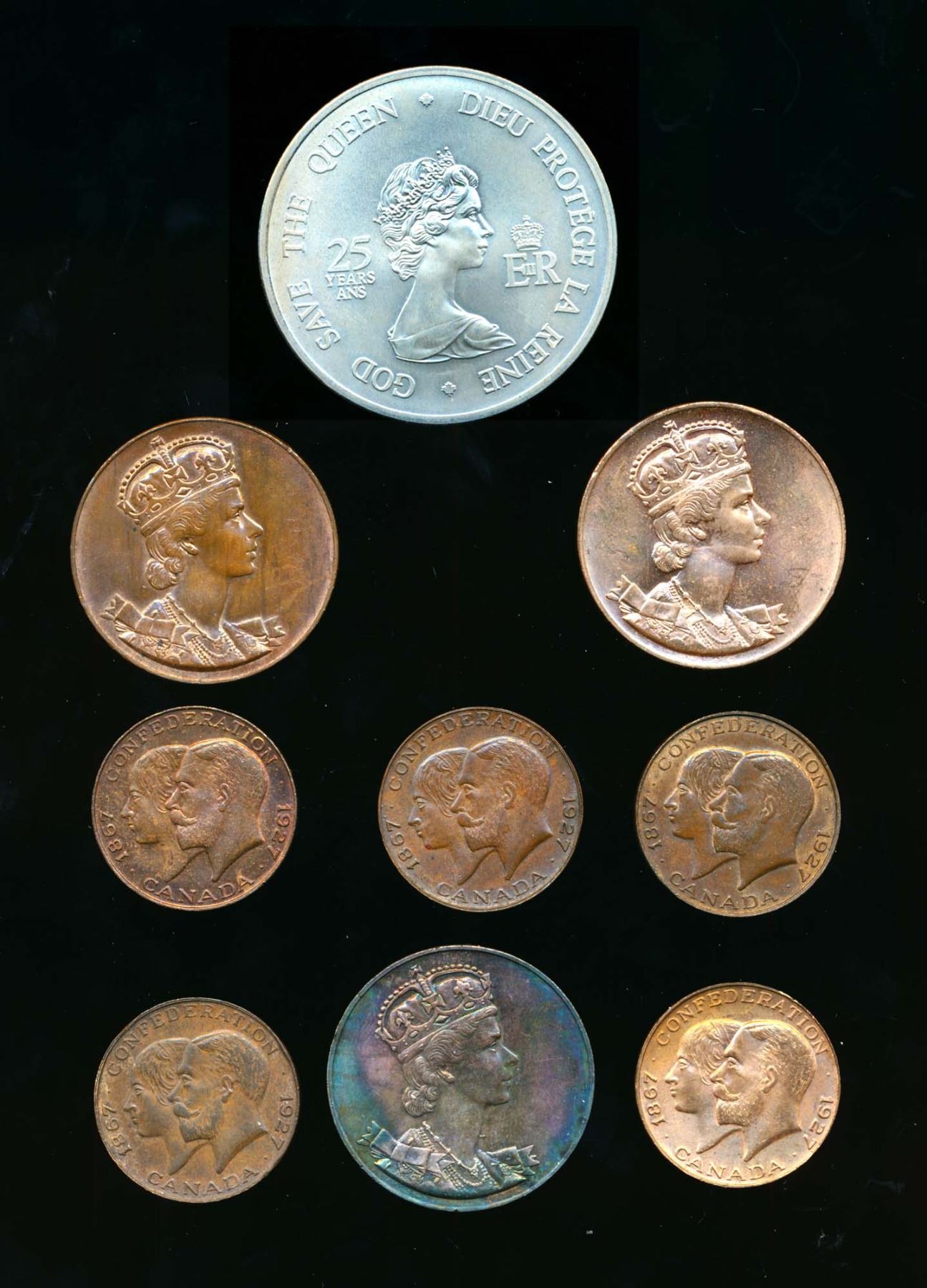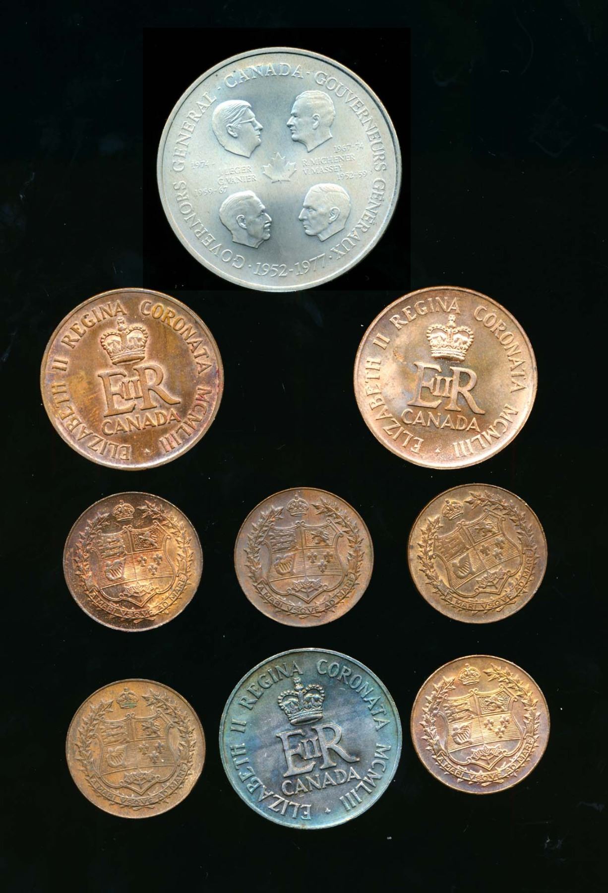 5 x 1927 50th. Anniversary of Canada EF-UNC, 3 x 1953 Coronation medals 1 x Silver plated 17.9 gm and 2 x 17.6 gm. bronze UNC and 1977 AE-45 25th. Anniversary Governor Generals' medal UNC