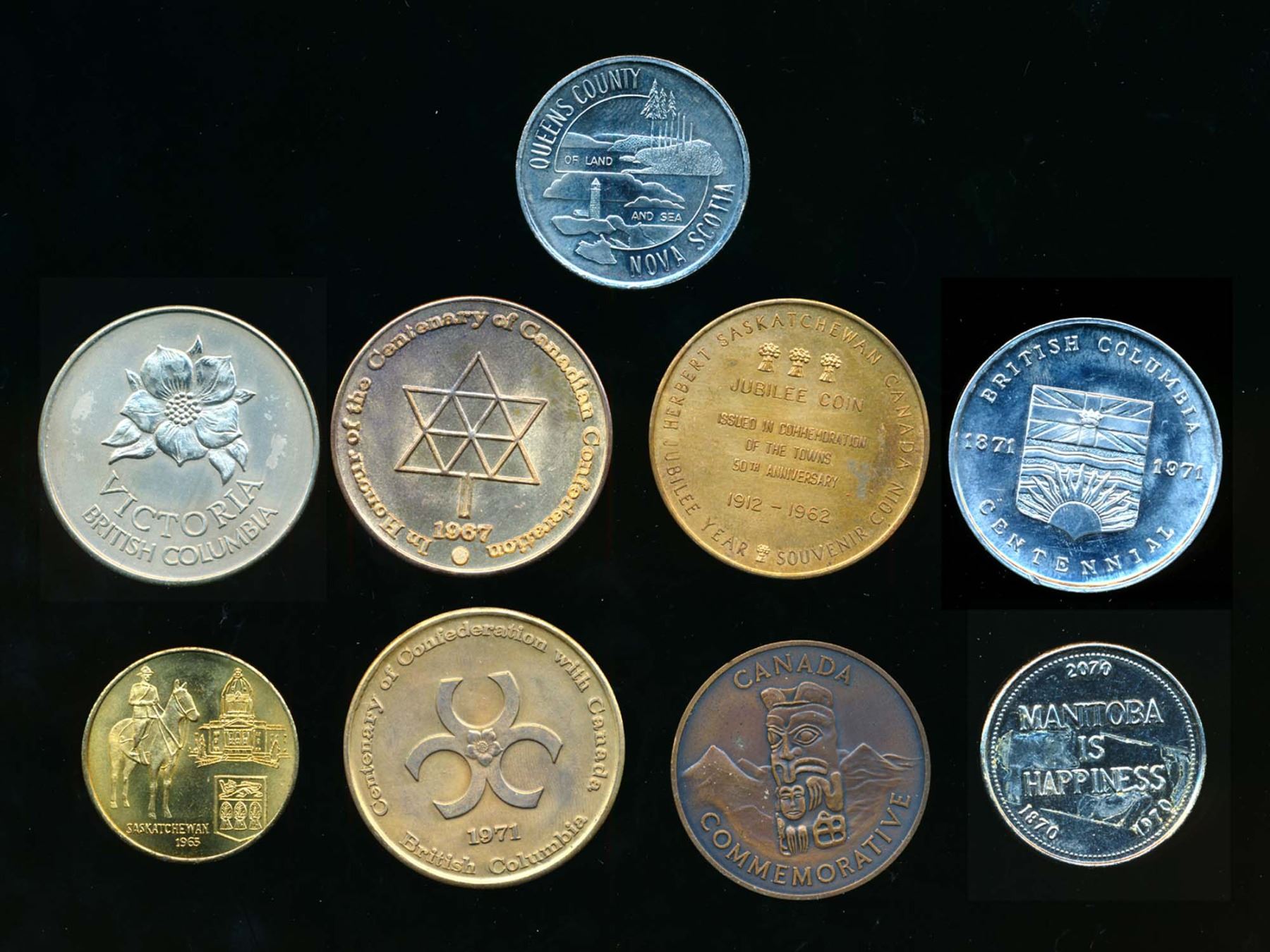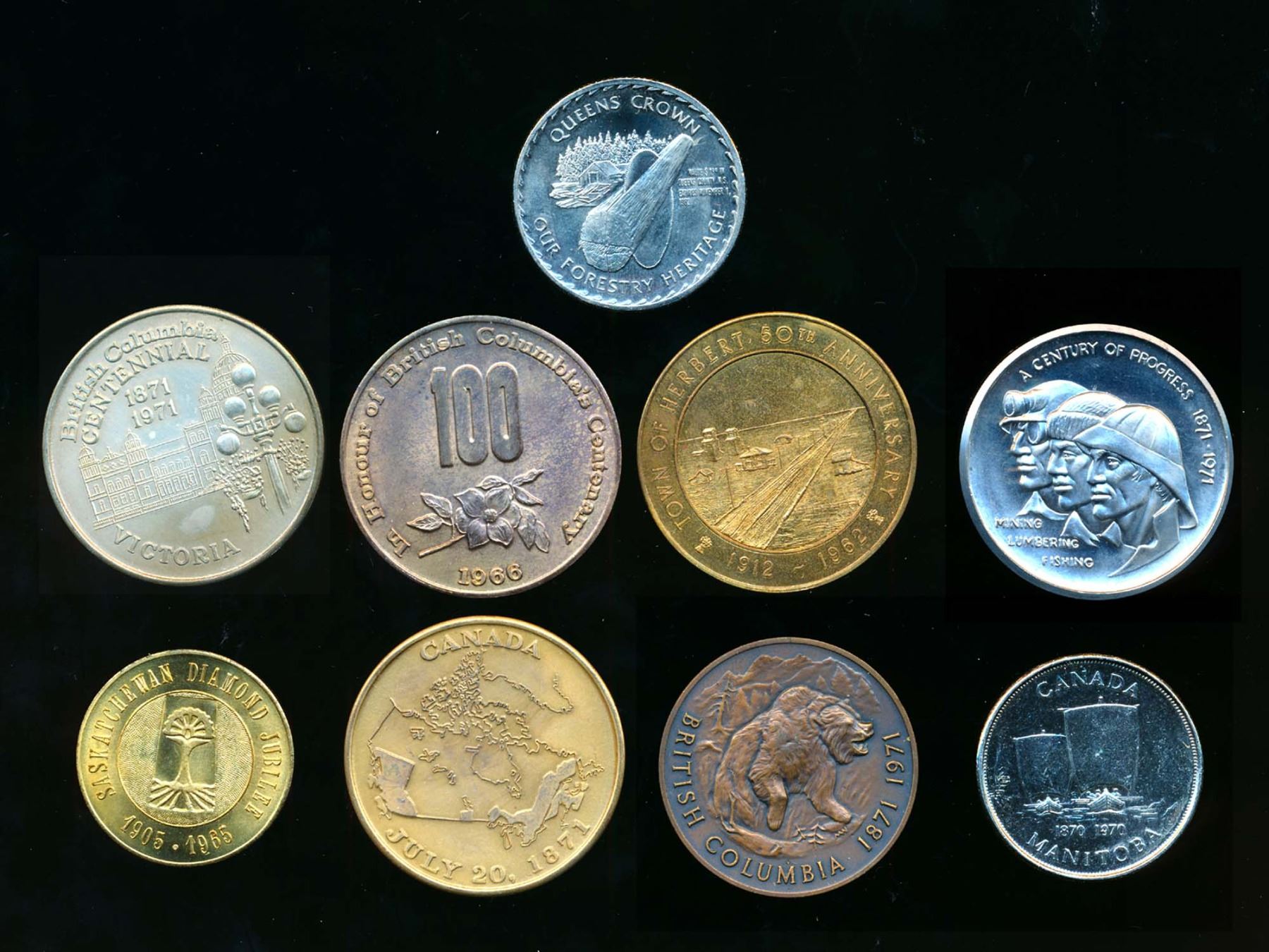 1962 Herbert, Sask., 1965 Sask. Jubilee, 1970 Manitoba Centennial, 4 x 1971 B.C. Centennial,1982 Queens County, Nova Scotia. Should be viewed