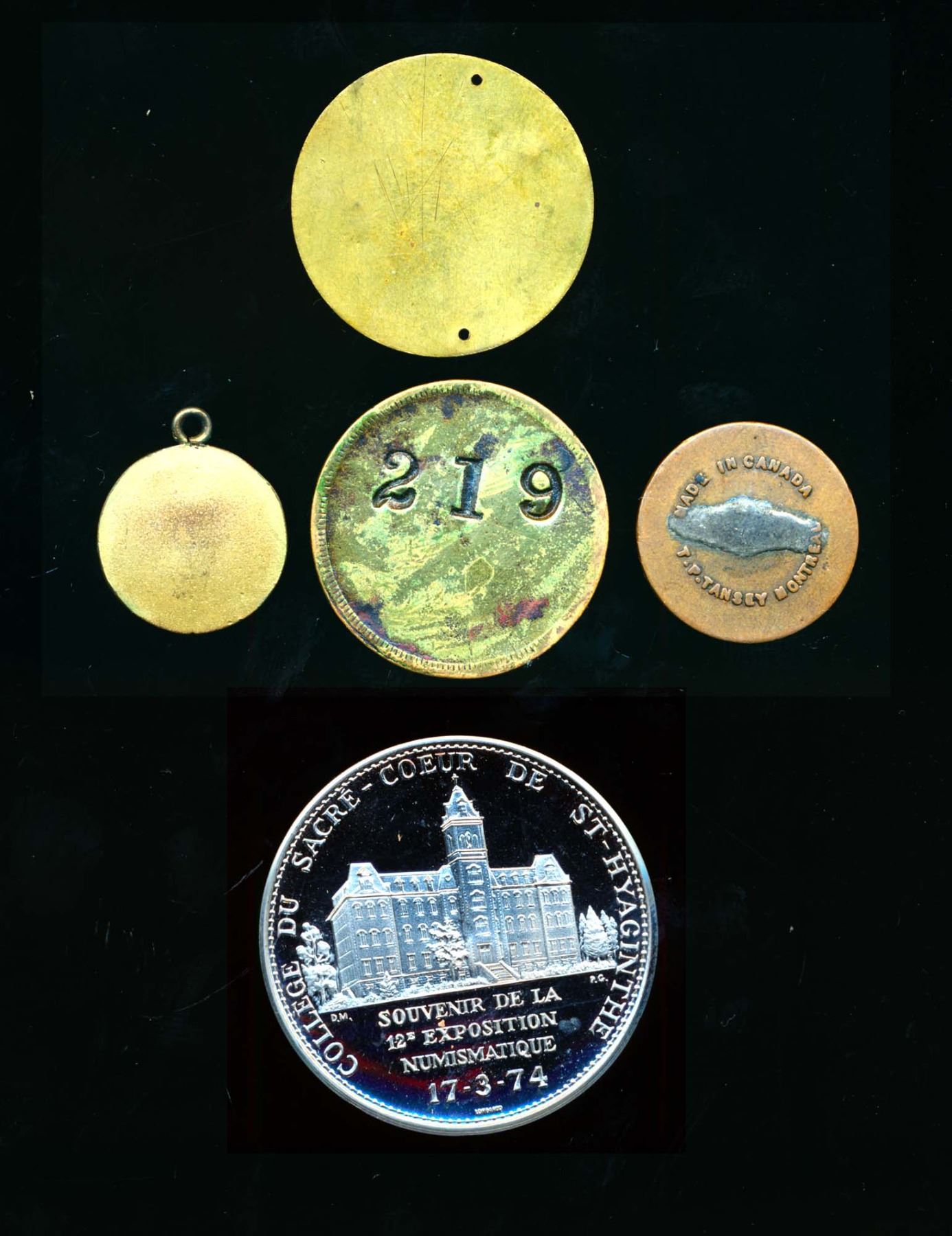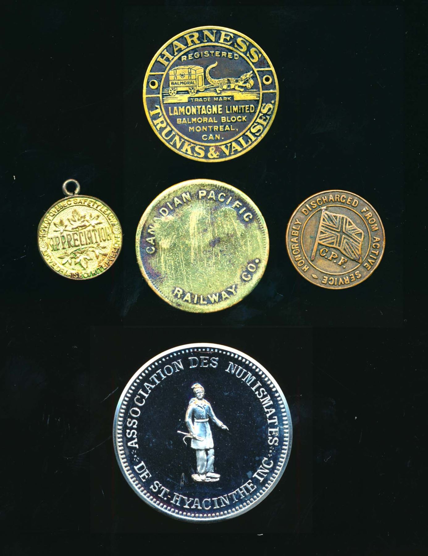 1974 Assoc. des Numismates de St-Hyacinthe Inc Souvenir de la 12e Exposition AE-39 Silver Plated by Lombardo UNC in capsule, Lamontagne Limited, Montreal AE-23 1.97 gms. Balmoral Trademark of Harness Trucks and Valises Unc., Province of Quebec Safety League Appreciation Medelette AE-18 Gold gilded 2.29 gms. w/loop.VF, Canadian Pacific Railway Co. Worker's Check Brass 29 mm. 6.48 gms. #219 VF, Canadian Patriotic Fund Button AE-21 3.75 gms. by T.P. Tansley. The piece is not enamelled and the back has been removed.VF.