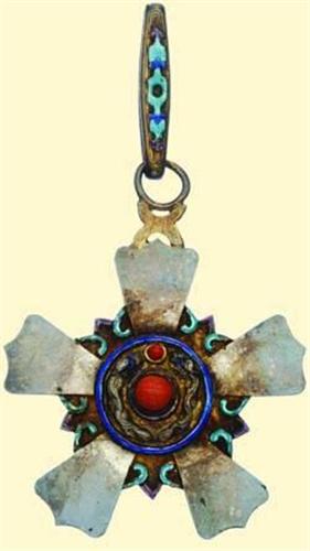 Grand Cross Badge - 2nd Type; sash badge, silver, partially gilt and enamelled, with centre coral and small one above, small parts enamelled; reverse blank, with suspension loop (both sides enamelled). Attractive design!