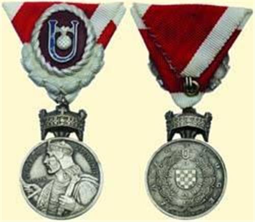 Silver Medal of Merit for Military; Breast medal, silver patinated, with rigid fixed crown, Croatian hallmarked, maker's mark "BK" (Braca KNAUS, Zagreb); with new triangular ribbon (Croatian cockade -aluminium lacquered- glued to the ribbon).