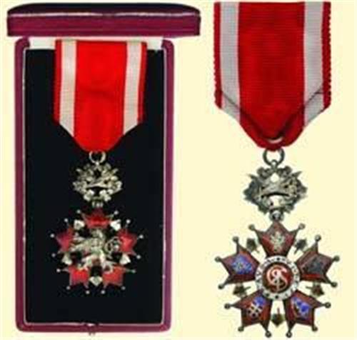 Knight's Cross for Civil (5th Class) - I.Type; breast badge, silver, partially enamelled, with superimposed lion silver-grey frosted, wreath with palm branches, suspension ring and original ribbon, hallmarked (900), maker's mark "KK"; with original box of issue (KARNET&KYSELY, Praha).