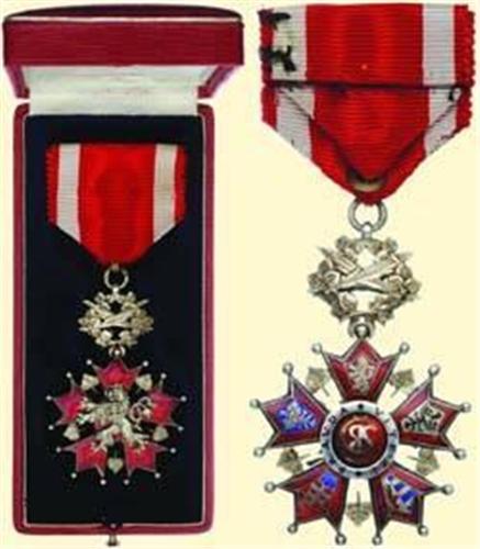 Knight's Cross for Civil (5th Class) - I.Type; breast badge, silver, partially enamelled, superimposed lion silver-grey frosted, wreath with palm branches, suspension ring and original ribbon, hallmarked (900), French swan-mark, maker's mark "KK"; with original box of issue (KARNET&KYSELY, Praha).