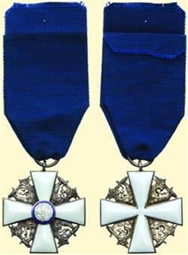Knight's Cross; breast badge, silver enamelled, hallmarked, maker's mark "A.T."; with ribbon. Small enamel damage on obverse, signs of wearing!