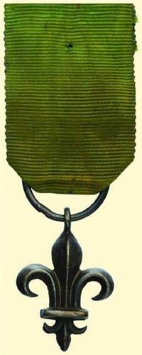 Breast badge; silver, no crown, one sided hollow construction, size 16 x 23 mm, with large suspension ring and old green ribbon.