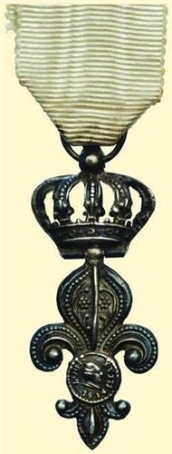 Breast badge; silver patinated, with crown, with ornamental decoration, with small medallion (Louis XVIII. 1814), size 16,5 x 41 mm, with small ribbon. Interesting design!