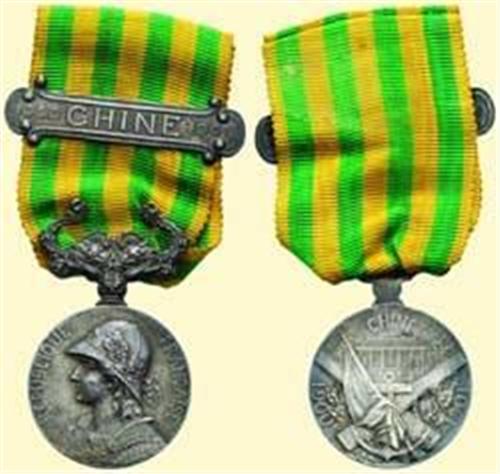 China Medal 1902; breast badge, silver with fixed mounted suspension bar in Chinese style, official mint marks, signature "GEORGES LEMAIRE", with original ribbon with bar "1900 CHINE 1901". Small signs of contact, nice patina!
