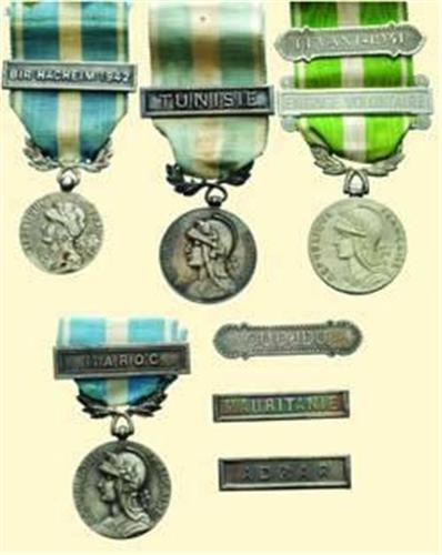 Colonial Medal 1893; lot of four medals together with eight ribbon bars; different types, silver hallmarked, white metal, copper silver plated, bronze silver plated, sizes 26,2 - 30,1 - 29,8 - 30,1 mm, two with signatures "GEORGES LEMAIRE"; with different ribbons and bars: ADRAR, BIR HACHEIM 1942, ENGAGE VOLONTAIRE, LEVANT - 1941, MAURITANIE, MAROC, OUDIDA, TUNISIE.