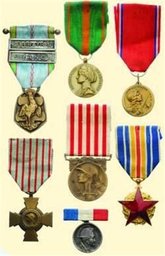 Group of Seven; Croix du Combattant; War Medal 1914-1918; Medal of Refugees; Commem. Medal 1939-1945 with bars: "Liberation" and "France"; Verdun-Medal; Colonial Wounded Badge; all bronze, 1x gilt and obverse enamelled; small silver Napoleon medal with ribbon bar.