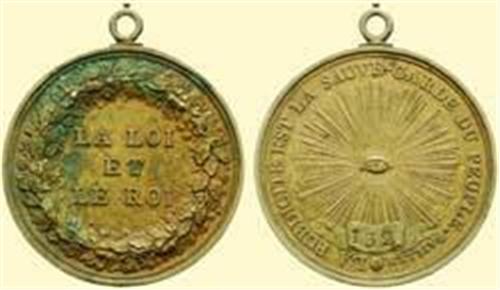 Identity Medal of the State Security (Secret Police); large cast bronze medal with loop, obverse with an all seeing eye and inscription "LA PUBLICITE EST LA SAUVE-GARDE DU PEUPLE" (BAILLY, M.), numbered "132", on reverse "LA LOI ET LE ROI", diam.: 58,8 mm. Some verdigris on reverse. Very interesting old medal, very rare!