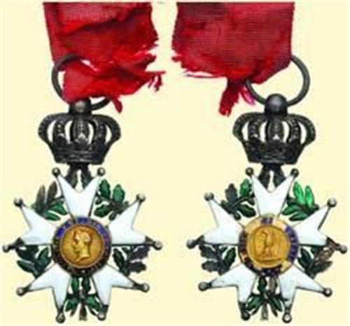 Knight's Cross - 5th/6th Type "La Presidence" (1851-52); Breast badge in silver, gold centre medallions (Napoleon's head facing to the left) and enamels (as usual, some damage to the wreath and to the medallions' circle); no cross on top of the crown. With grooved suspension ring and original ribbon. Fine, dark patina.
