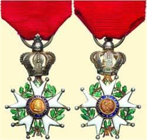 Knight's Cross - 3rd Type (1813-30) - Half Size Badge; Breast badge of reduced size (25,5 x 41 mm.) in silver and enamels (some minor damage); very fine centre medallions in two-color gold, with separately made King's portrait and "fleurs de lis" (minor crack to the obverse blue circlet); grooved suspension ring with hallmark (fasces) and original ribbon. A highly attractive piece.