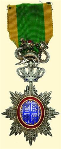 Knight's Decoration; breast badge, silver brilliant cut, centre medallion gold and enamels, with crown and dragon above, reverse blank, with short piece of original ribbon. Excellent old continental quality with tiny enamel damage in centre and signs of cleaning, very attractive!
