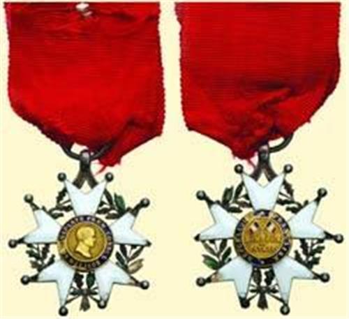 Knight's Cross - 5th Type (1848-1852); Breast Badge, silver enamelled, medallions gold ("BONAPARTE PREM. CONSUL / 19 MAI 1802"), reverse with crossed flags ("Republic…"), no crown, size 38,5 x 42 mm, grooved ring, short piece of old ribbon. Heavy enamel damage, some points are bent, one ballpoint is missing, a sorry sight but useful for documentation!