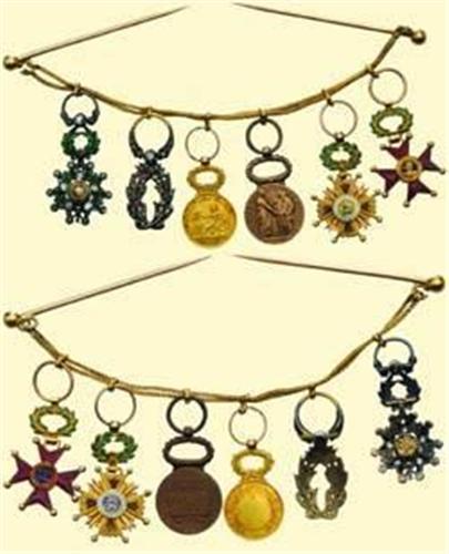 Miniature Chain of Six; Legion of Honour - Knight's Cross with Diamonds (silver, partially enamelled, set with rose cut diamonds), Academic Palms - Knight's badge with Diamonds (silver, partially enamelled, set with rose cut diamonds); France: Goldmedal of the National Society for Encouragement of Good Deeds (gold); Bronzemedal of the Society for Helping One Another; Spain: Order of Isabella the Catholic - badge (gold and enamels); Vatican: Order of St. Gregory - badge (gold and enamels); together on fine gold chain with pins. Very fine quality and condition!