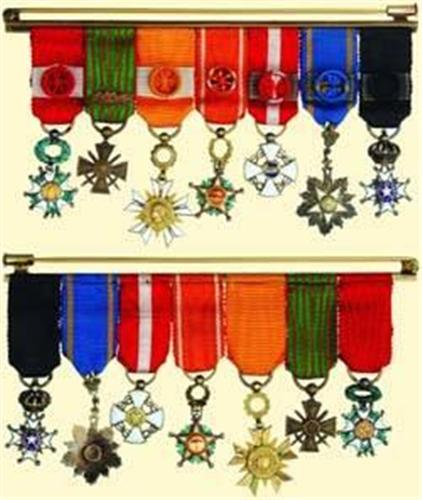 Miniature Group of Seven; France: Legion of Honour - Commander 1870; Croix de Guerre 1914/1918 with Palms on ribbon; Order of National Economy - Commander; Morocco: Order of Ouissam Alaouit Cherifien - Officer; Italy: Order of the Crown - Commander; Egypt: Order of the Nile - I.Type - Commander; Sweden: Order of the Northern Star - Commander. Mostly silver, silver gilt, partially enamelled, with ribbons with rosettes,mounted on a silver gilt bar with pin. Very attractive miniature bar with small signs of wearing.