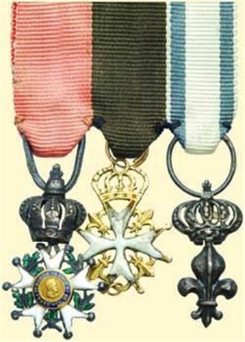 Miniature Group of Three; Order of the Legion of Honour, Knight's Cross - 3rd Type (1816-1830; silver enamelled, gold medallions); Order of Malta, old type Knight's Cross, gold, white and black (!) enamelled, with fleurs de lis and crown; Decoration du Lis, silver patinated, small version. All with one combination ribbon of later production. Some enamel damage, but very attractive!